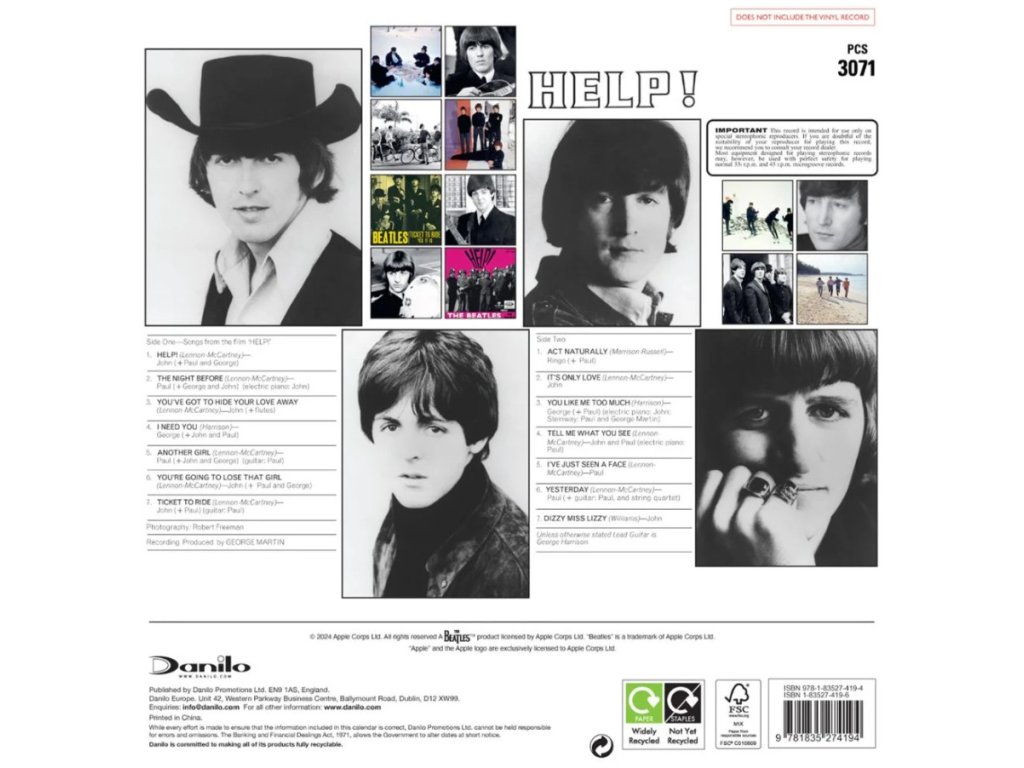 Nástěnný kalendář čtvercového square formátu (30,5 x 30,5 cm), provedený jako LP vinylová deska s celkem 12 fotografiemi a grafickými obrázky k albu Beatles.