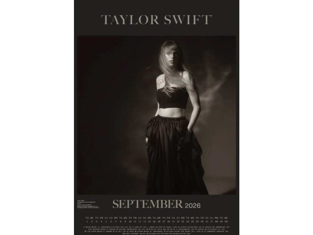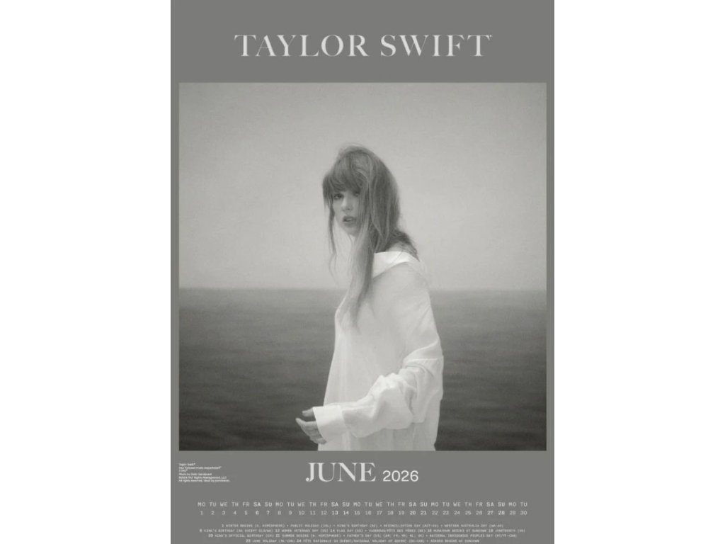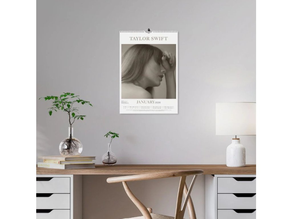 Oficiální produkt - dvanáctiměsíční nástěnný kalendář na rok 2026 s licencí americké zpěvačky Taylor Swift.