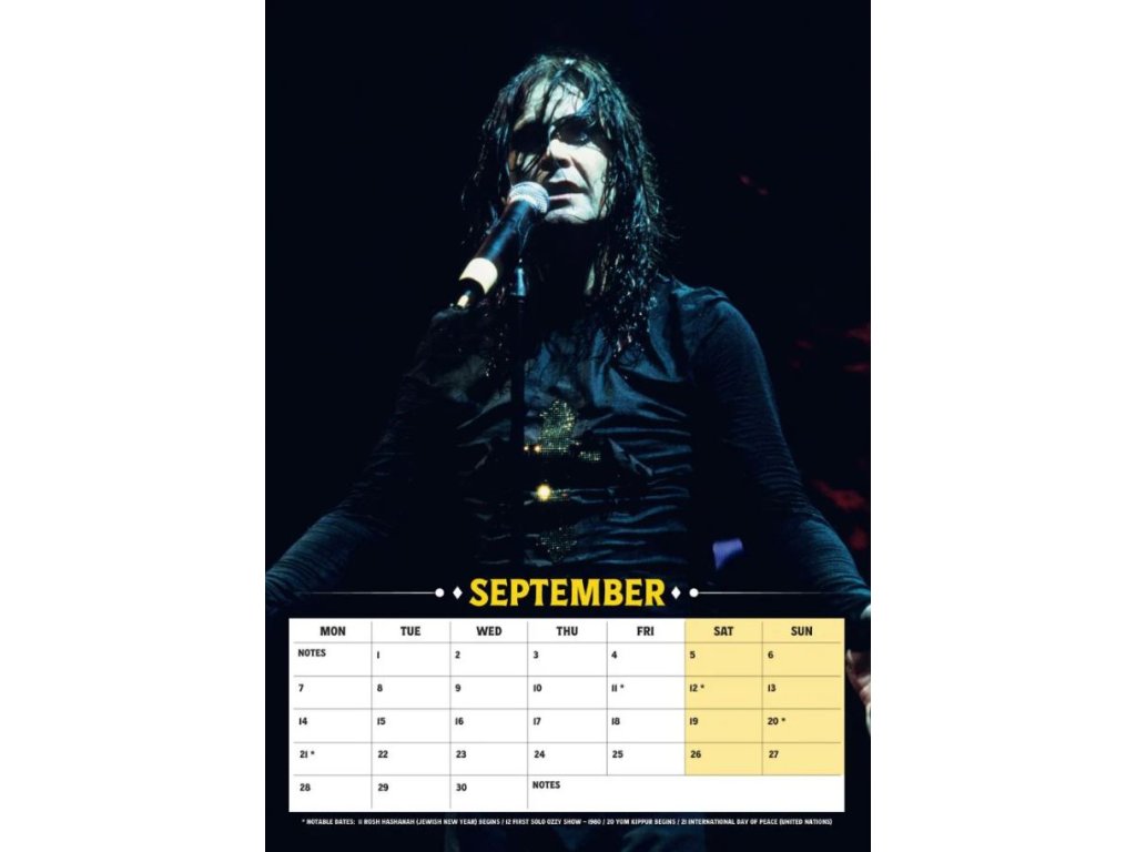 Dvanáctiměsíční nástěnný kalendář A3 formátu (29,7 x 42 cm) s celkem 13 oficiálními autorizovanými fotografiemi hudebníka Ozzy Osbourne.