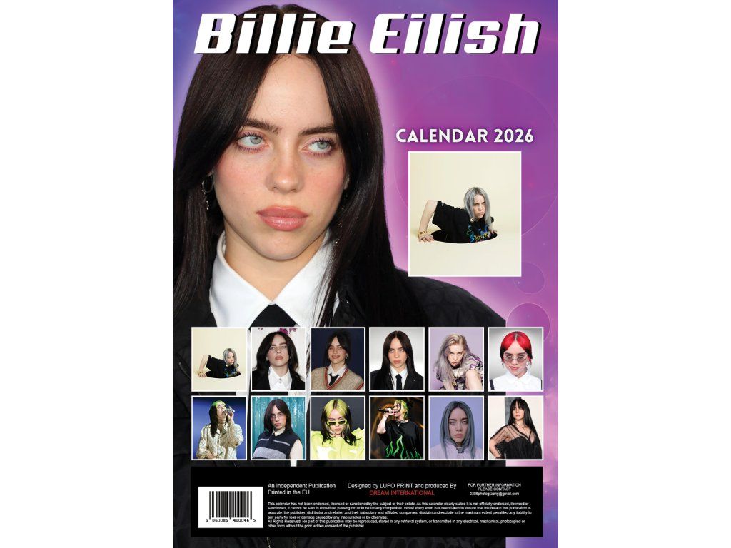 Oficiální produkt - nástěnný dvanáctiměsíční kalendář zpěvačky Billie Eilish na rok 2026.