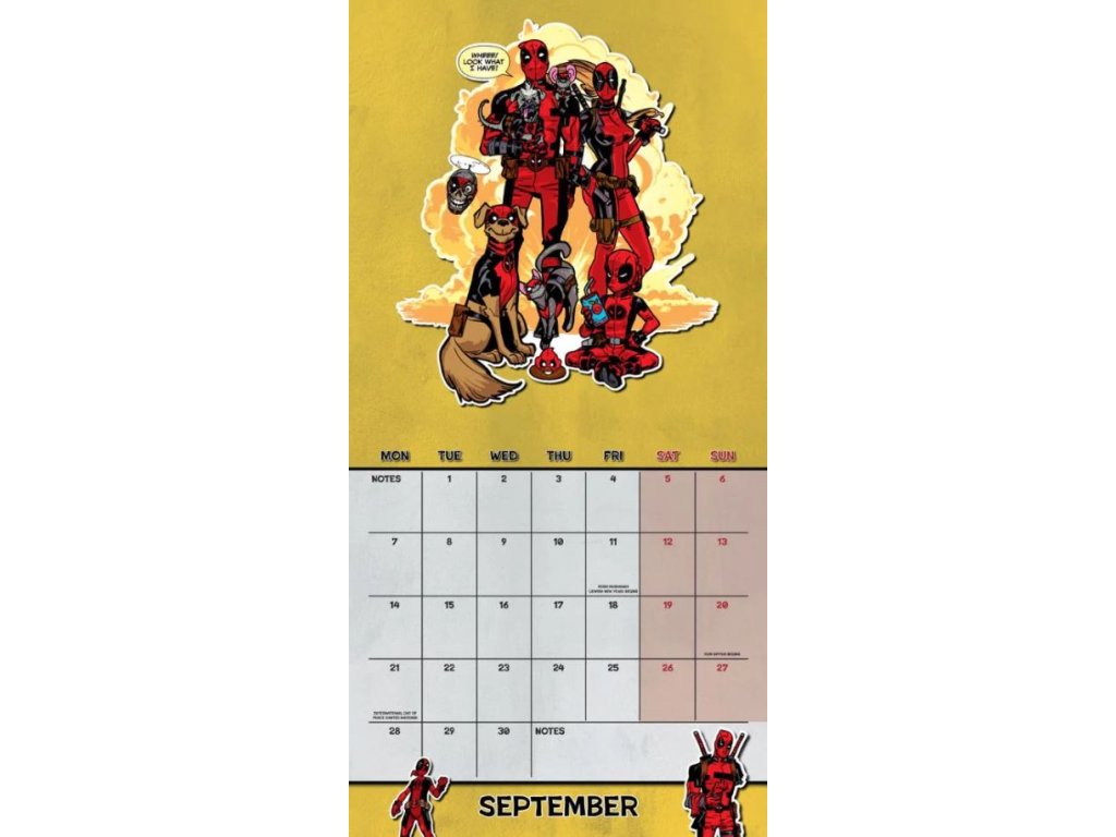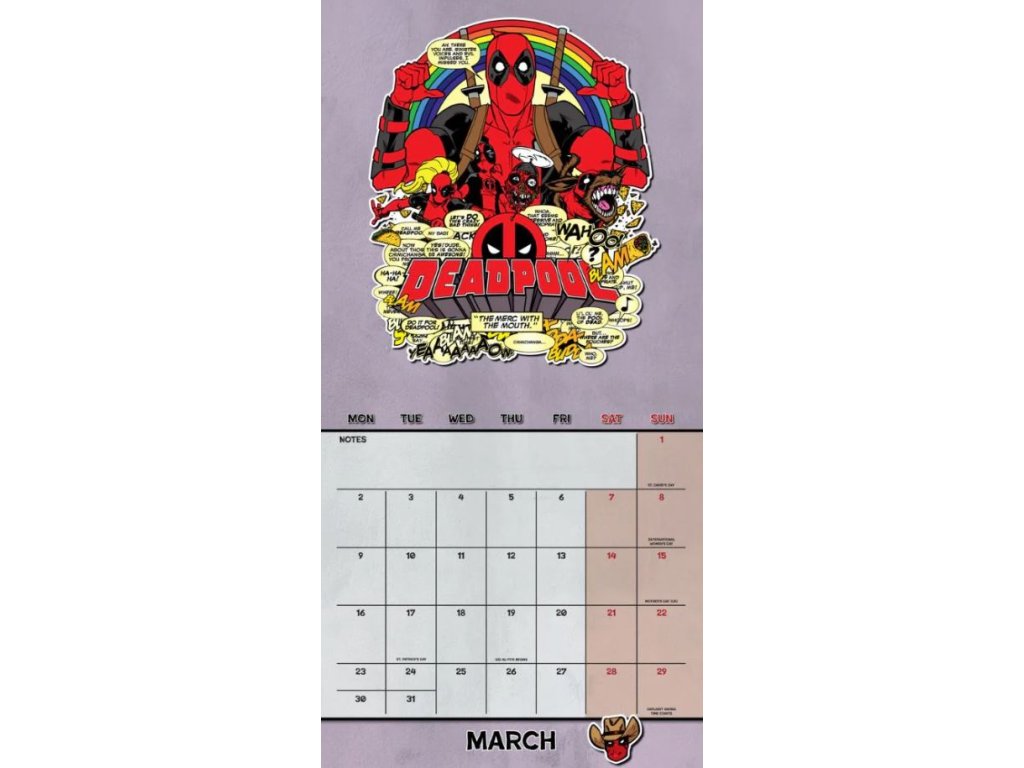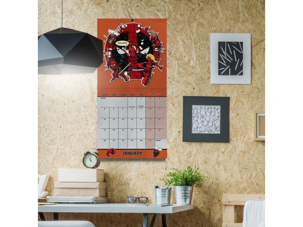 Oficiální dvanáctiměsíční nástěnný kalendář studia Marvel na rok 2026 s komiksovou licencí Deadpool od společnosti Marvel.