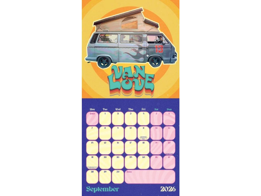 Oficiální produkt - nástěnný dvanáctiměsíční kalendář automobilky Volkswagen na rok 2026 s licencí kultovní verze automobilu Transportér.