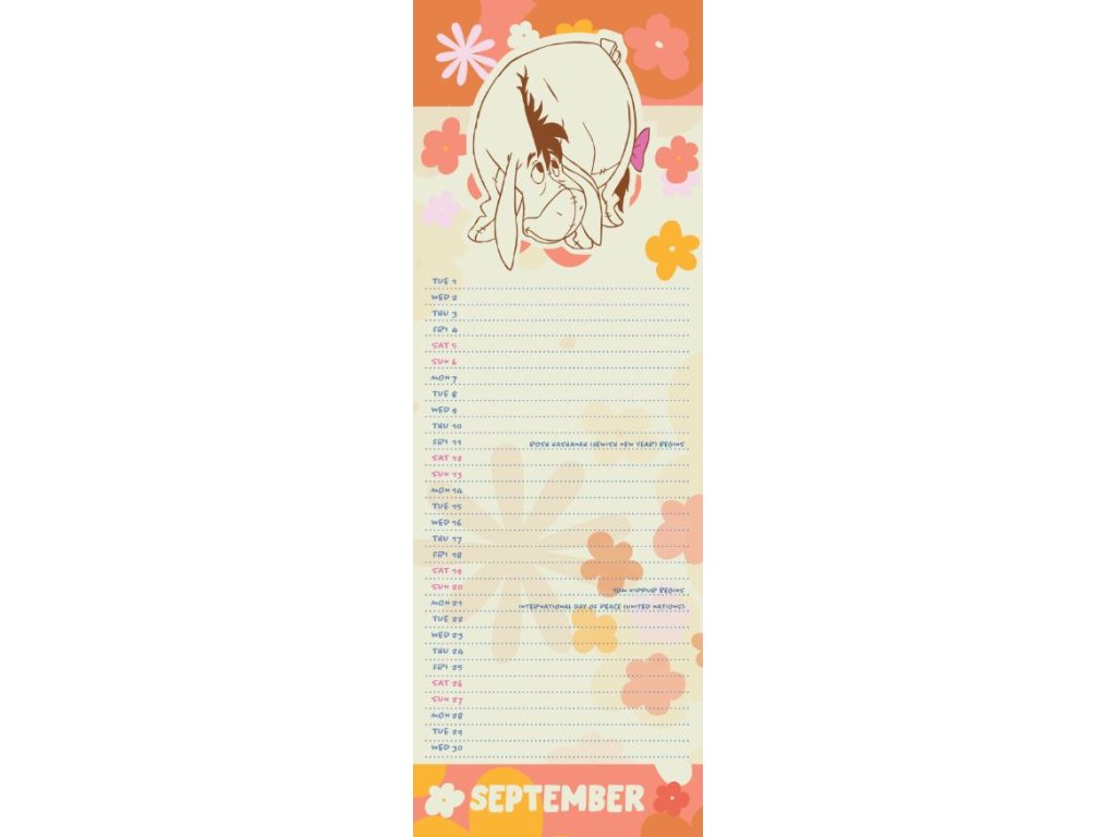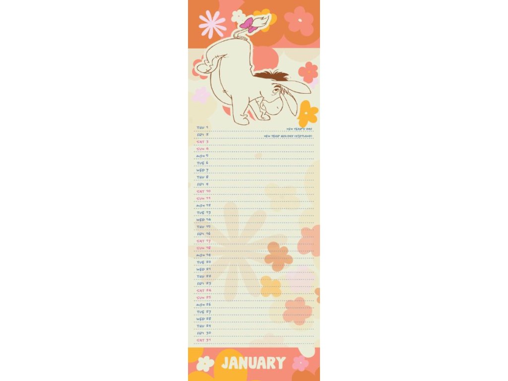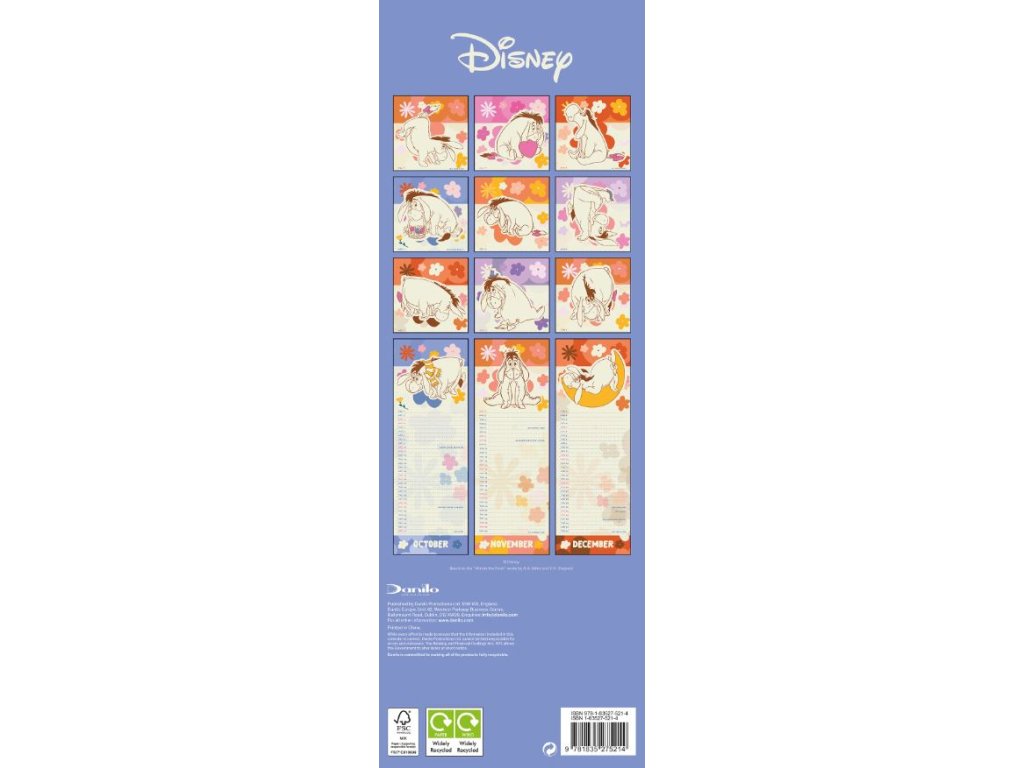 Dvanáctiměsíční nástěnný kalendář slim - polovičního A3 formátu (14,4 x 42 cm) s celkem 13 kreslenými obrázky oslíka Ijáčka z animovaných filmů Medvídek Pú.
