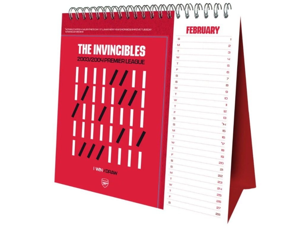 Dvanáctiměsíční otáčecí stolní kalendář v kroužkové vazbě s měsíčními listy a fotografiemi napříč historií fotbalového klubu FC Arsenal Londýn.