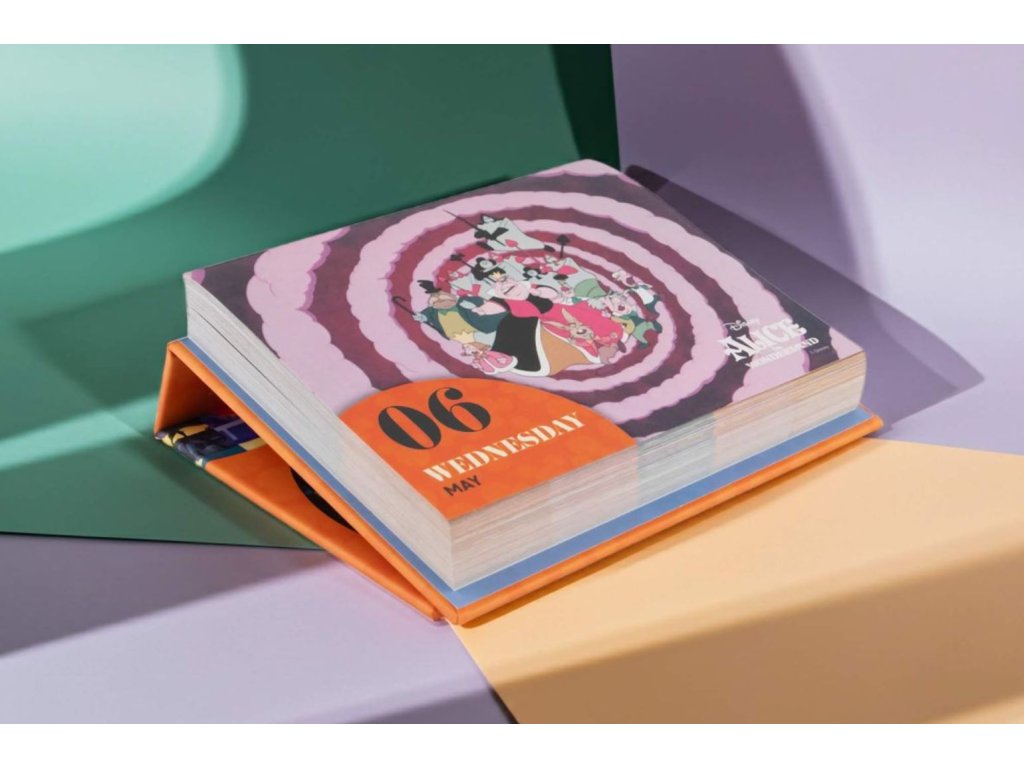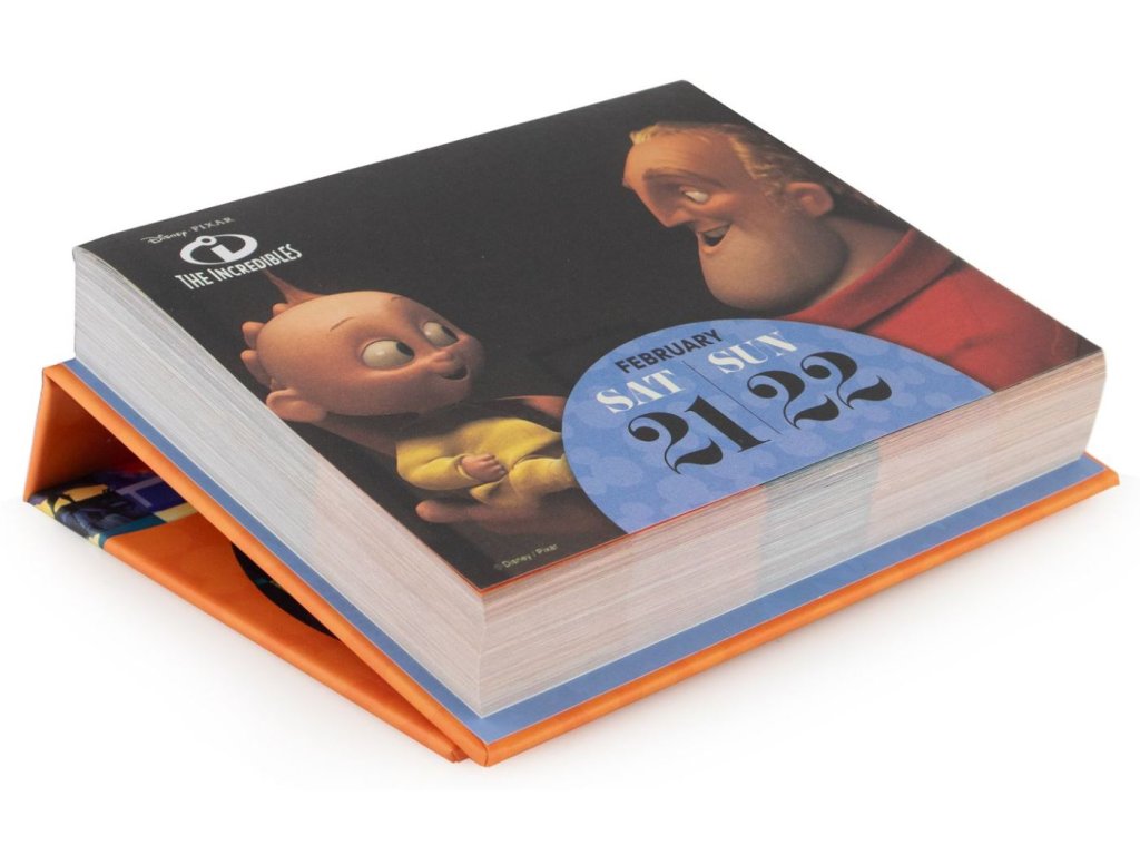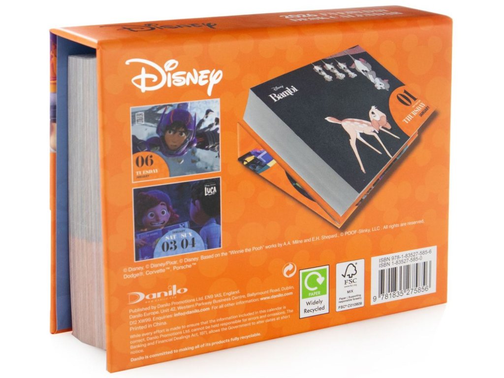 Denní stolní trhací kalendář formátu 15 x 13 x 4 cm s celkem 365 obrázky postaviček z dětských animovaných filmů studia Walta Disneyho.