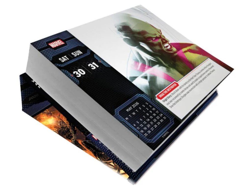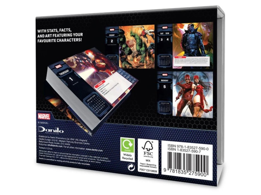 Denní stolní trhací kalendář s celkem 365 obrázky komiksů, komiksových plakátů a stránek časopisů se všemi možnými záporáky a superhrdiny. Kalendář je vhodný pro všechny menší i větší fanoušky Marvel komuksů a stálé či budoucí superhrdiny.