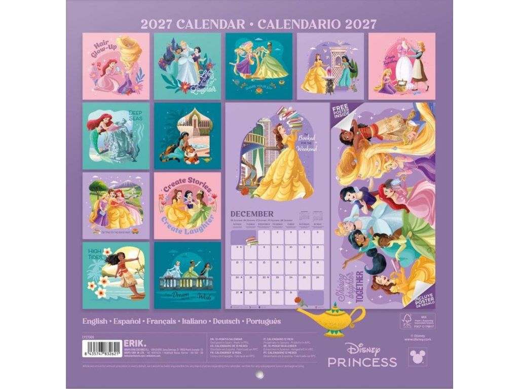 Oficiální produkt - nástěnný kalendář na 12 měsíců roku 2027 s licencí princezen animovaných pohádek společnosti Walt Disney.