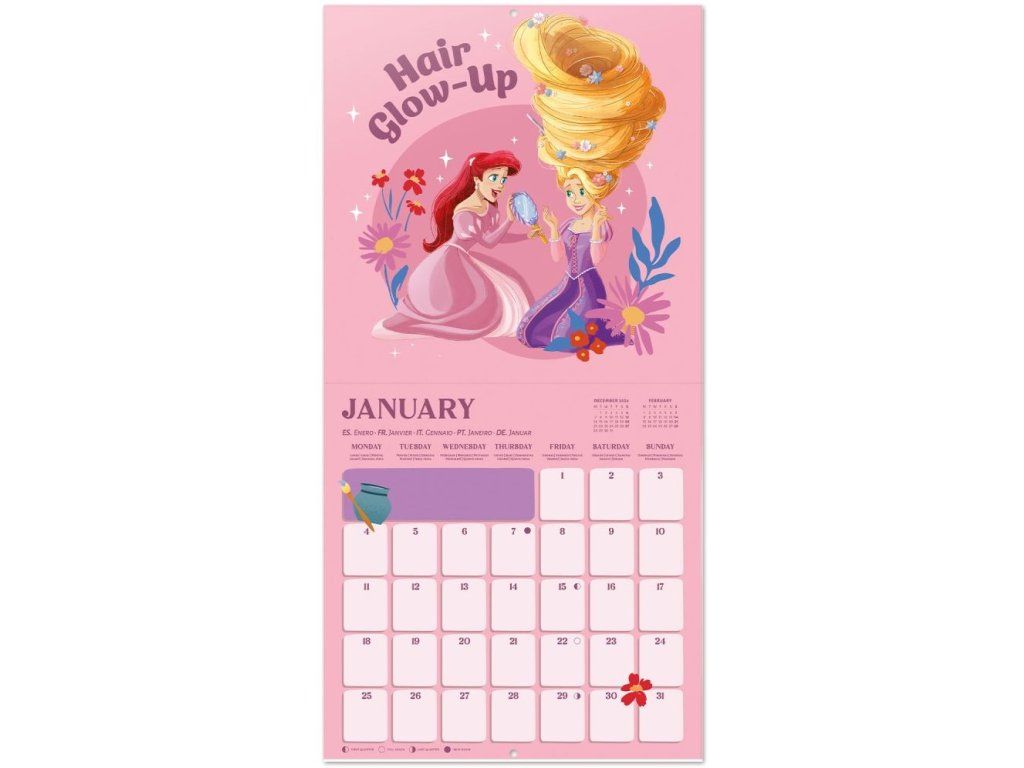 Dvanáctiměsíční nástěnný kalendář čtvercového square formátu (30 x 30 cm) s celkem 13 obrázky princezen z animovaných filmů studia Disney.