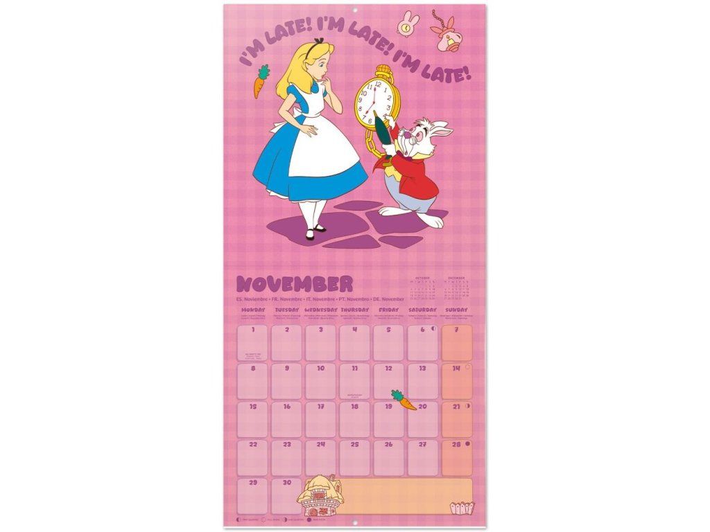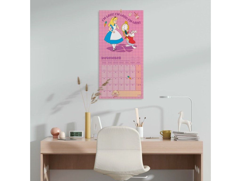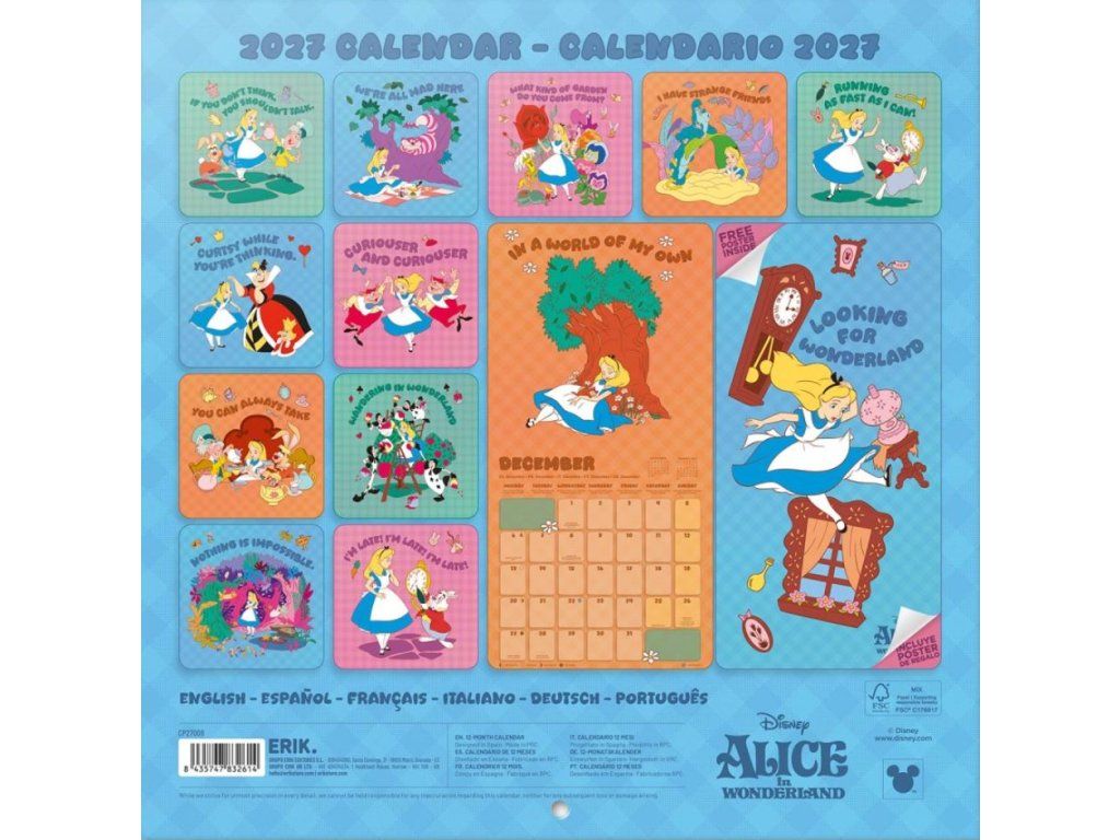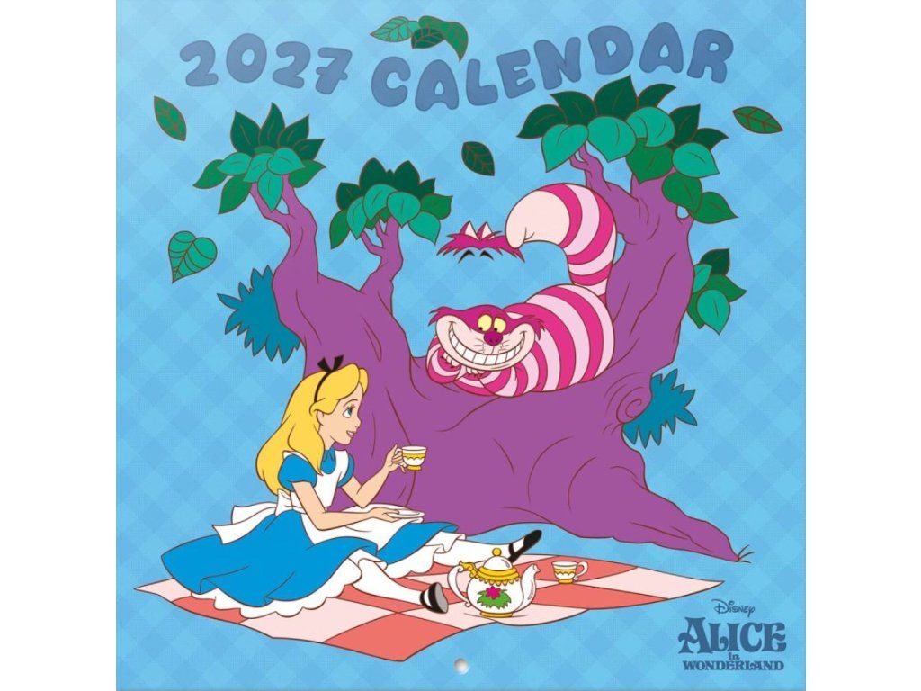 Oficiální produkt - nástěnný kalendář na rok 2027 s licencí animované pohádky Alice in Wonderland (Alenka v říši divů) společnosti Disney.