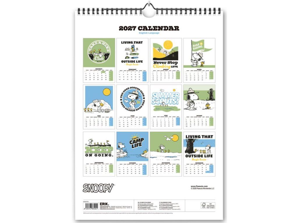 Oficiální produkt - nástěnný kalendář na rok 2027 s licencí kresleného psa Snoopyho.