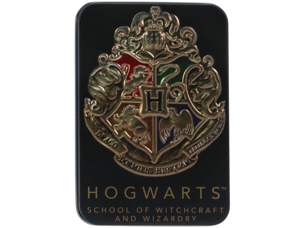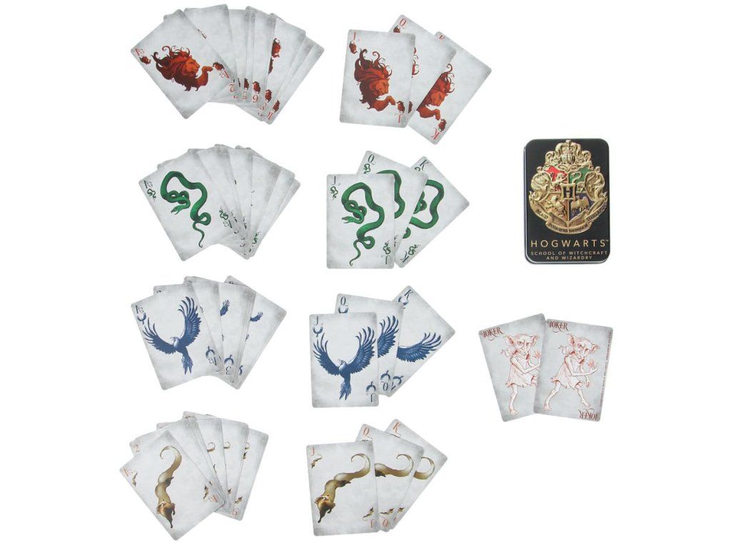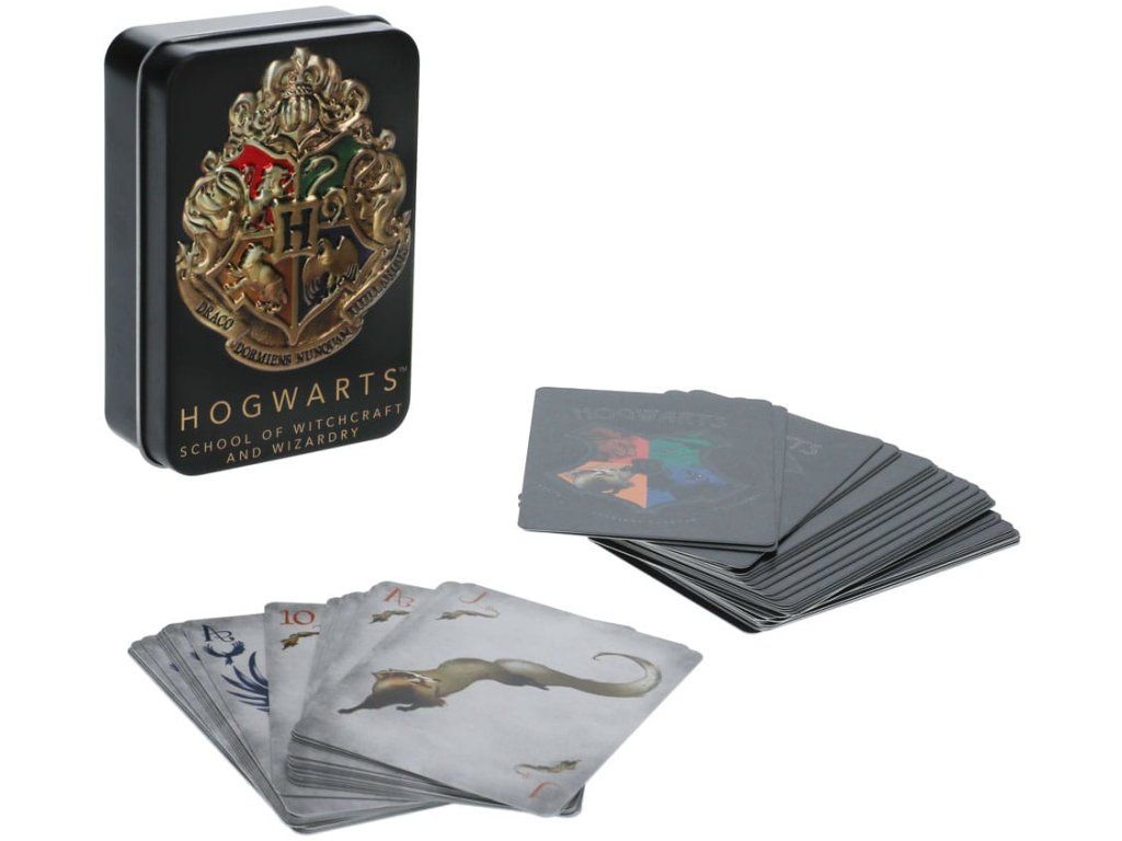 Hrací karty inspirované ságou Harry Potter. Balíček obsahuje 54 karet včetně dvou žolíků. Sada je dodávána v kovové ražené černé plechové krabičce, doplněné ikonickým erbem Bradavic.