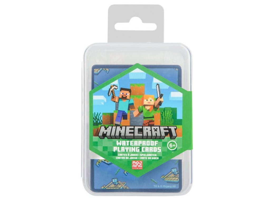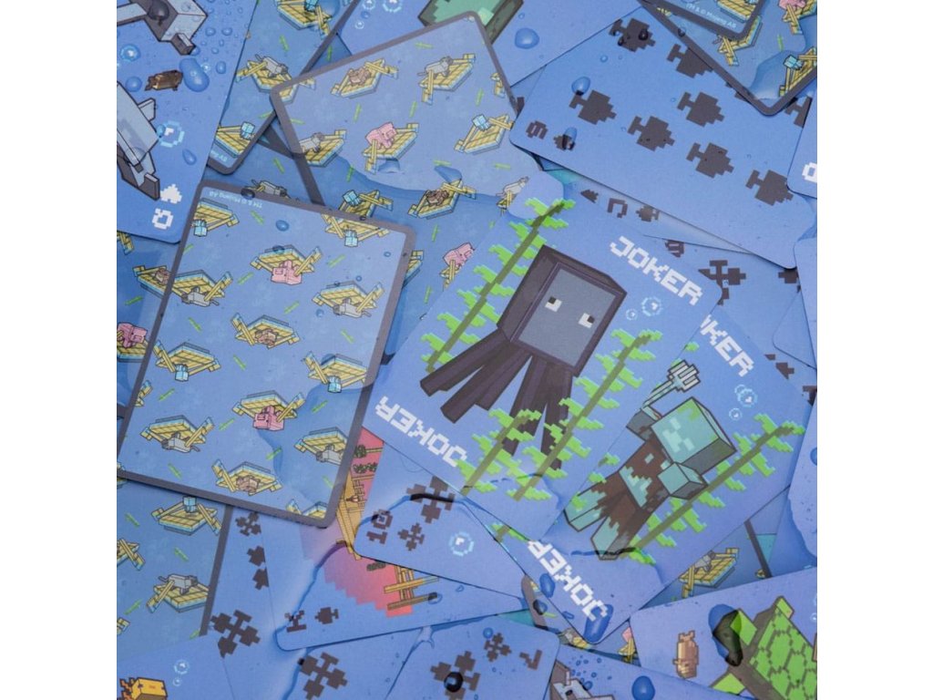Provedení: Balíček obsahuje živé ilustrace postaviček ze světa Minecraftu. Na modrých kartách jsou živé motivy vodních tvorů z Minecraftu, které představují podvodní moby, jako jsou Elder Guardians, Axolotls, Glow Squids, Dolphins, Turtles a další. Každá karta je voděodolná a snadno se otírá, což zajišťuje dlouhotrvající zábavu.