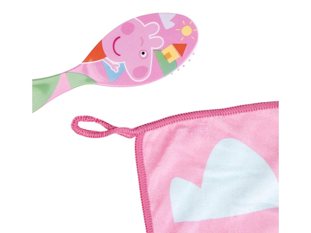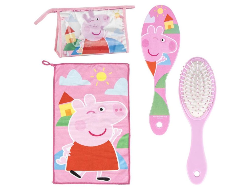 Roztomilý set kosmetických doplňků s motivem Prasátka Peppy potěší všechny malé i větší milovnice této ikonické postavičky. Jemné růžové provedení a jednotný design dělají z tohoto setu nejen praktického pomocníka, ale i stylový doplněk na cesty i doma. Set obsahuje hebký ručník, praktickou kosmetickou taštičku na zip a kartáč na vlasy, který je ideální pro každodenní úpravu vlasů. Vše je sladěno do hravého motivu pohádky Prasátka Peppy.