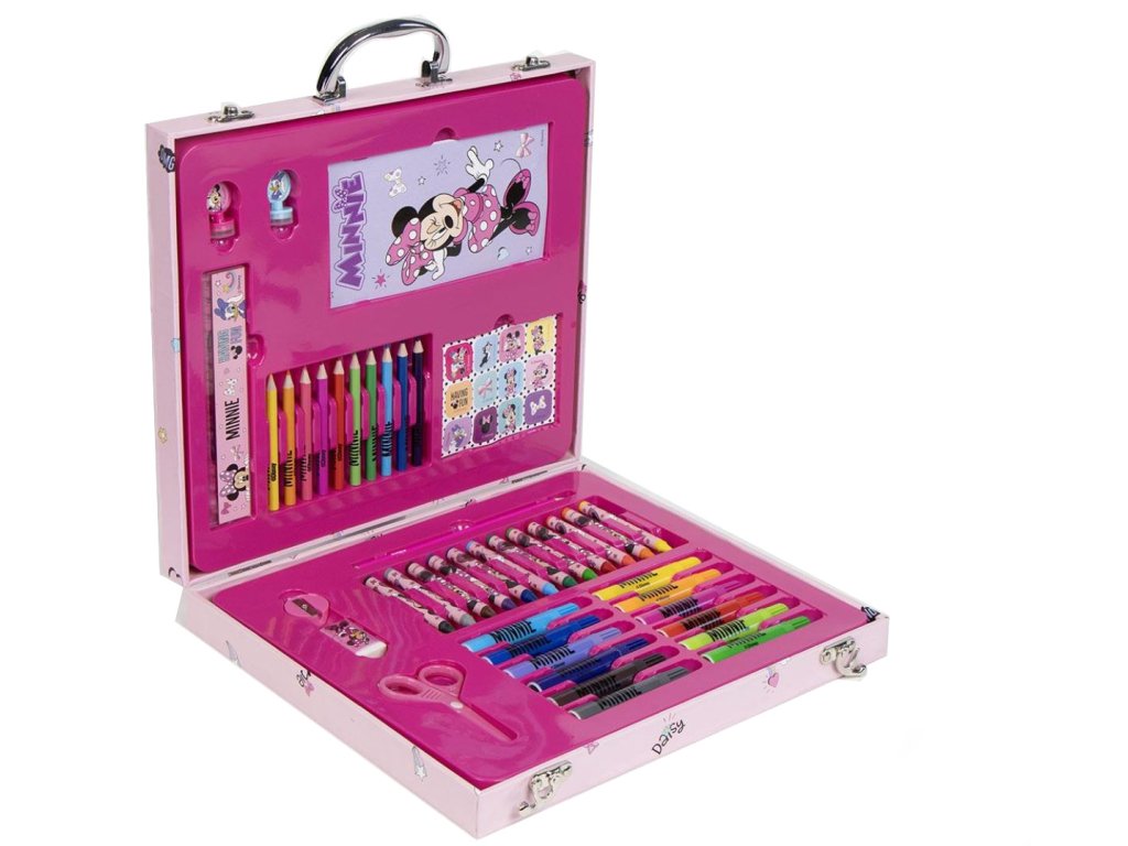 Kreativní kufřík s grafikou myšky Minnie a jejího kamaráda kocoura. Sada je vhodným dárkem pro všechny fanoušky, kteří si chtějí rozvíjet svou kreativitu a umění.