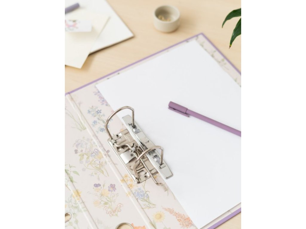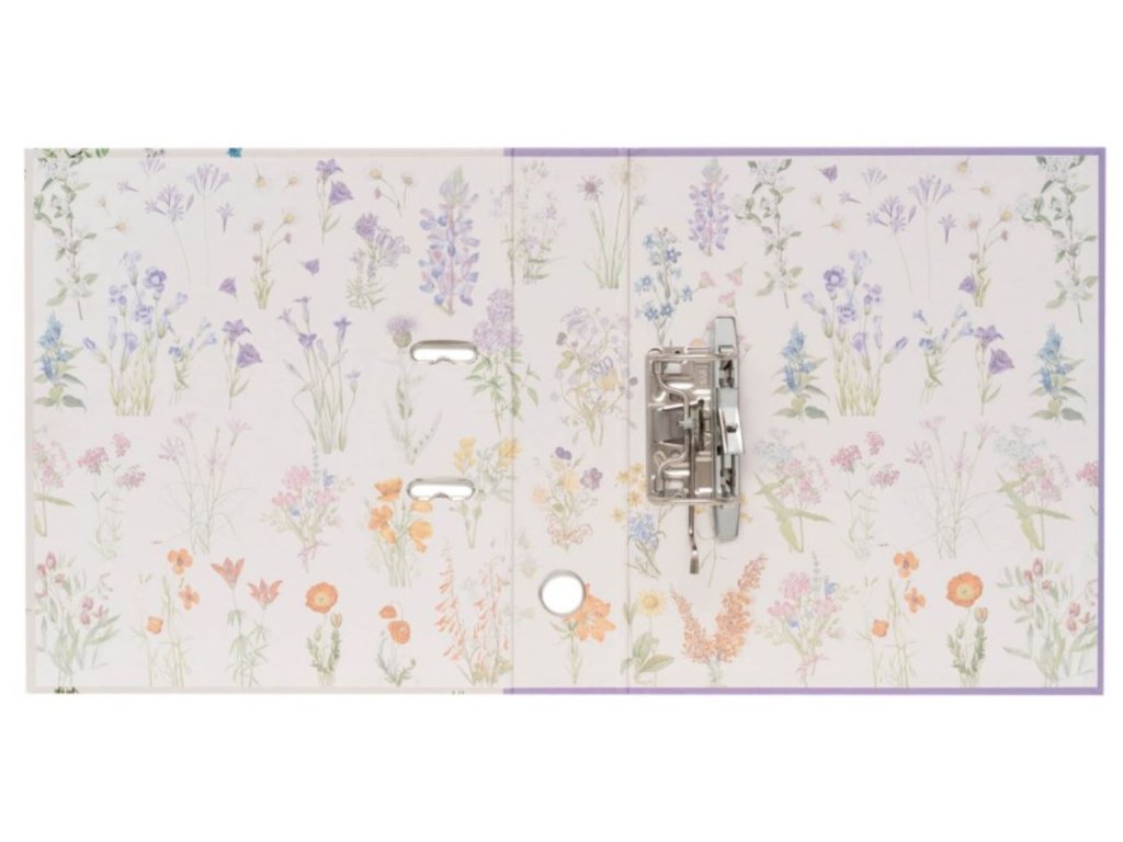 Kroužkový pořadač se spojovací svorkou se 2 kroužky v designu lučních a zahradních květin. Pořadač ve formátu A4 se 2 kroužky na eurosložky či dokumenty a pákovým mechanismem. Vyrobeno z tvrdého kartonu o tloušťce 2 mm a podloženo 150 g matným laminovaným papírem. Na hřbetu je otvor a identifikační štítek.