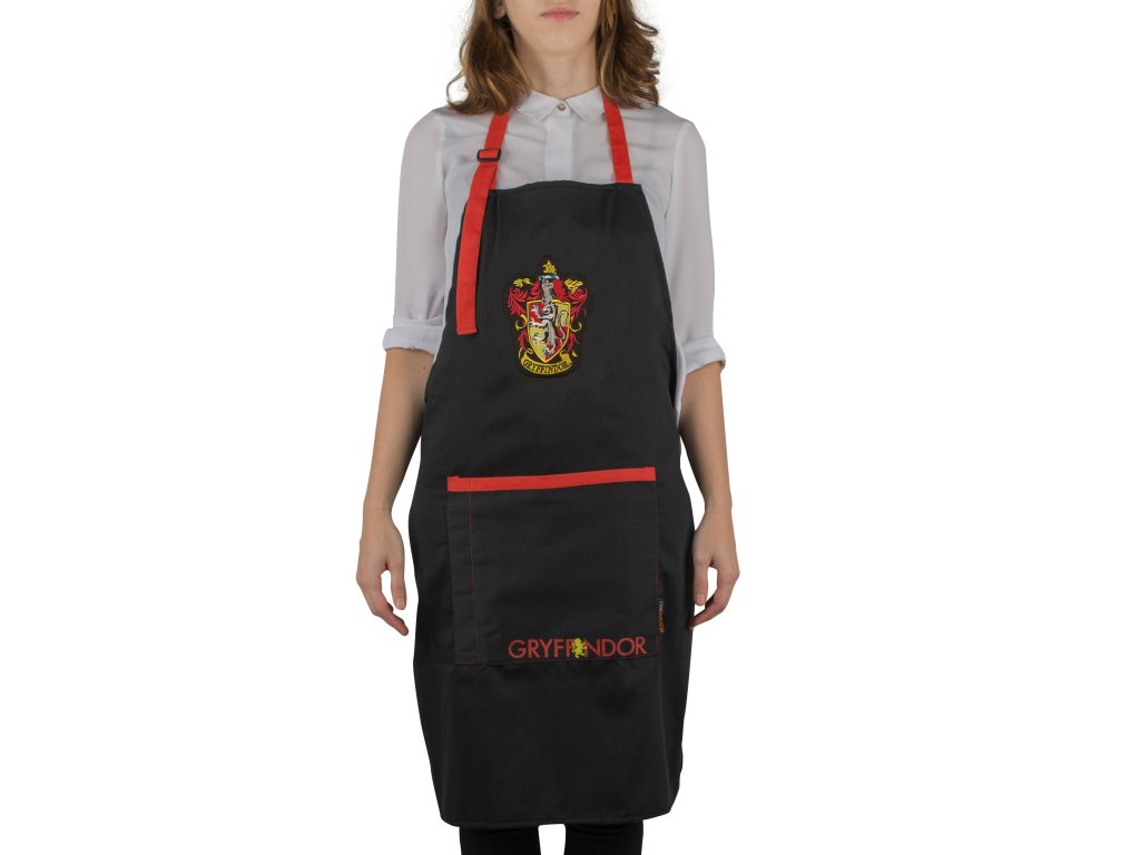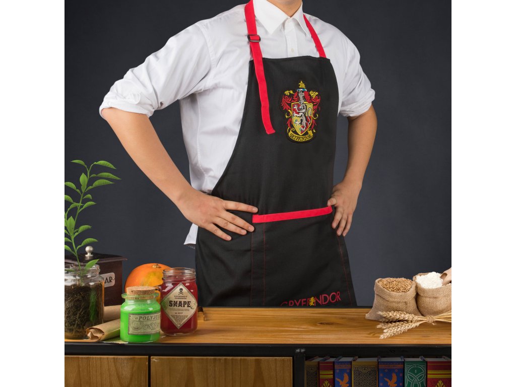 Černá kuchyňská zástěra s přední kapsičkou a červenými detaily, která je inspirovaná školní kolejí Graffindor (Nebelvír), z filmu Harry Potter.