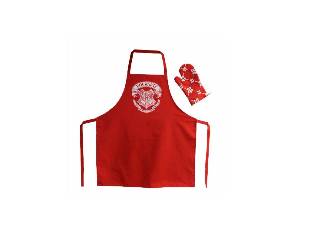 Kuchyňský set v červené barvě s bílými znaky kouzelné školy Bradavice, z filmové ságy Harry Potter. Set obsahuje kuchyňskou zástěru na zavazování a kuchyňskou chňapku.