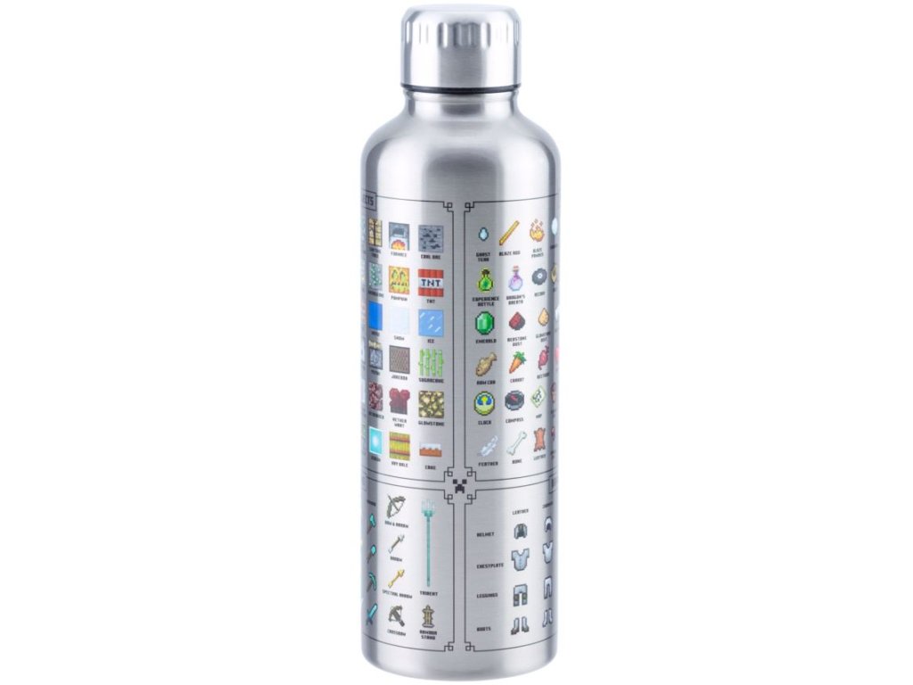 Nerezová láhev na pití inspirovaná surovinami a zbraněmi z počítačové hry Minecraft.