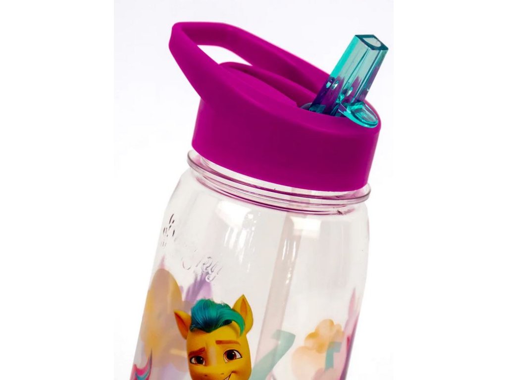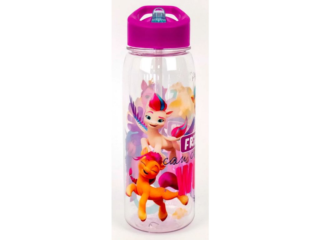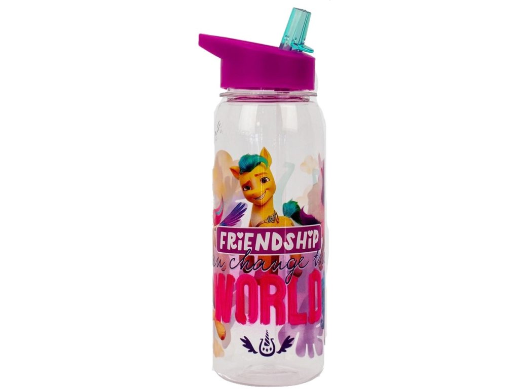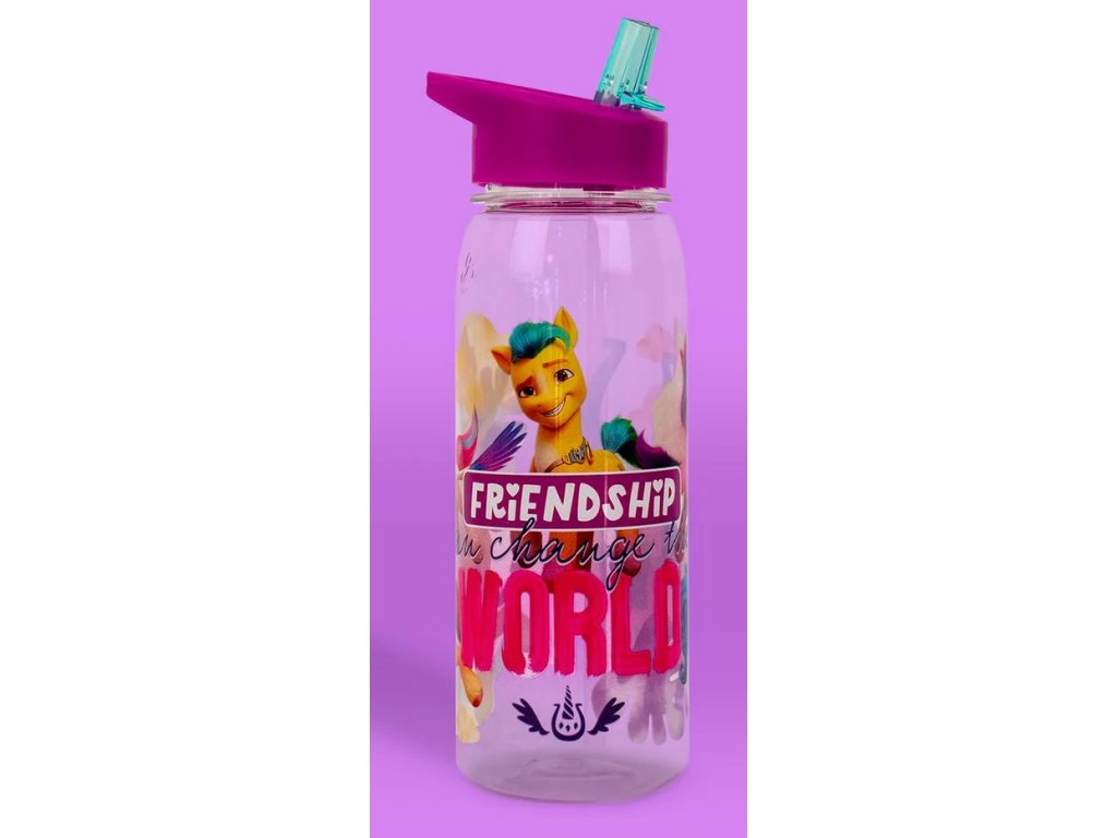 Plastová láhev na vodu s překlápěcím brčkem a plnobarevně potištěnou grafikou z animovaného filmu Můj malý Pony, Friendship (přáteltsví).
