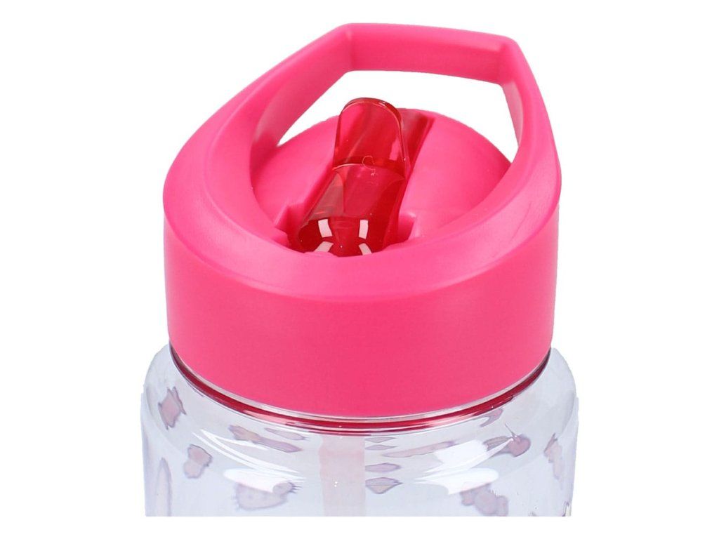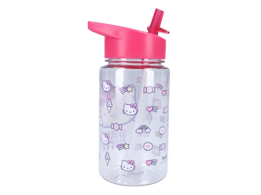 Láhev na pití vyvedená v motivu kočky Hello Kitty. Součásti láhve je i brčko.