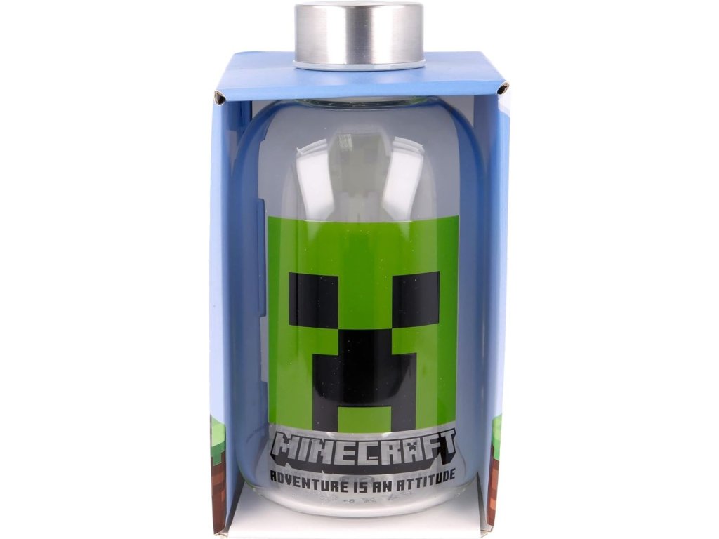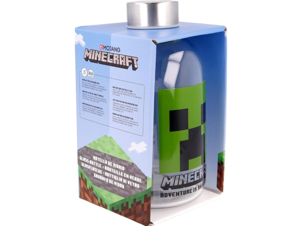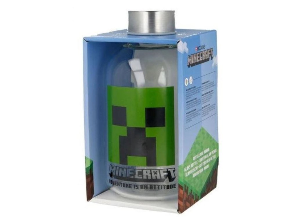 Oficiální produkt - skleňená láhev na pití se z katalogu výrobků s grafikou a licencí populární videohry Minecraft.