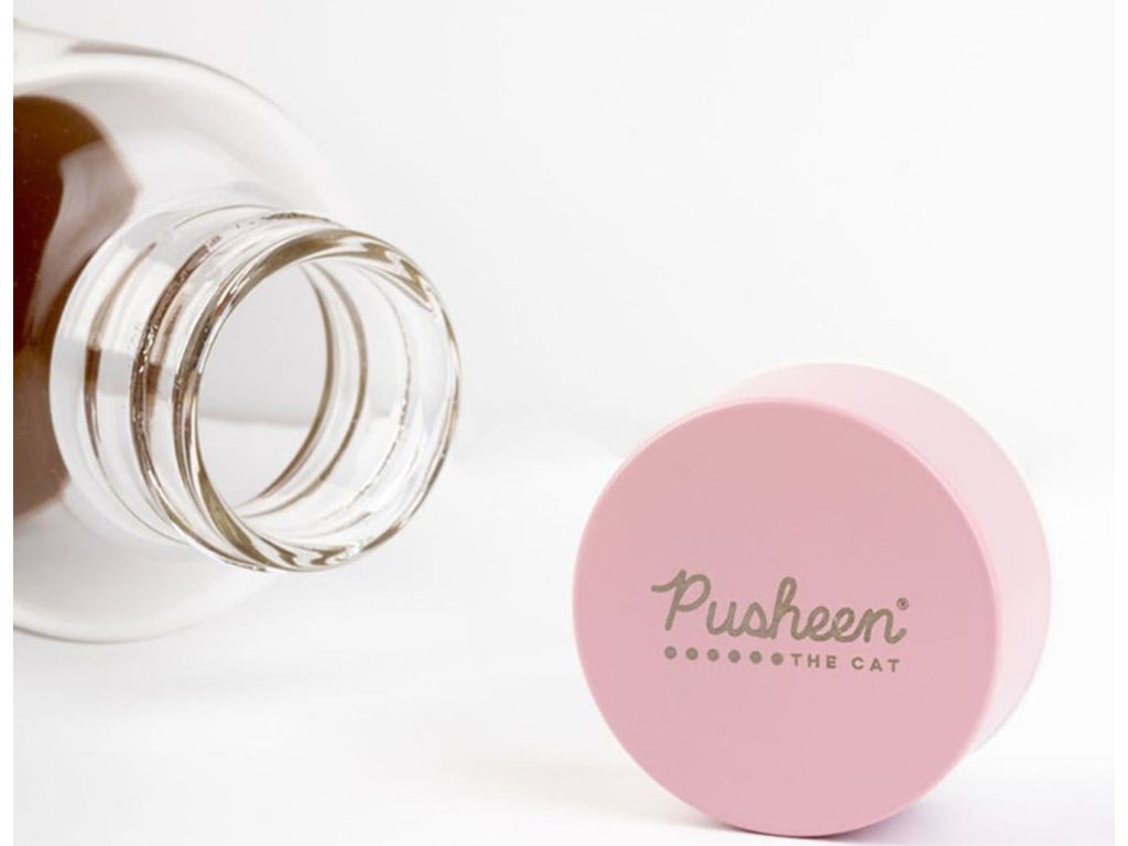 Oficiální produkt - skleněná láhev na pití z katalogu výrobků s grafikou a licencí populární kreslené kočky Pusheen.