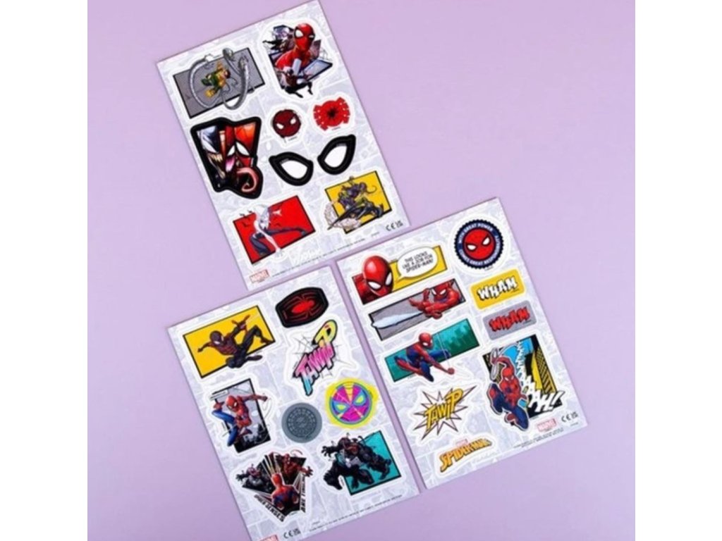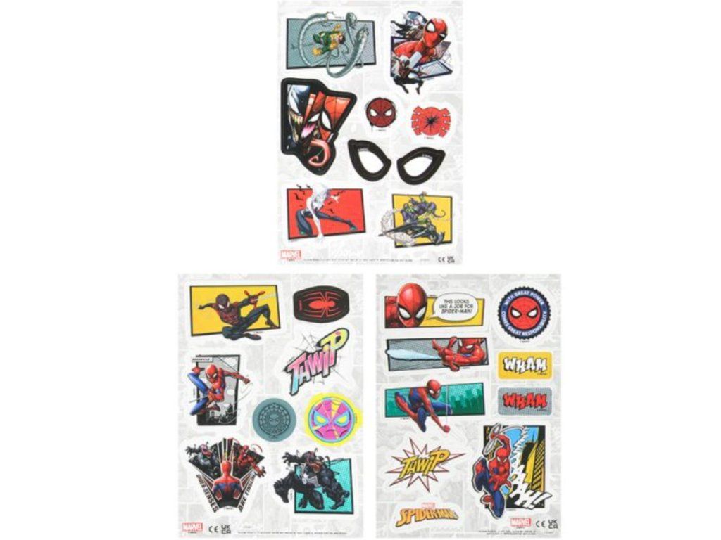 Set 3 listů magnetů s logem a grafikou ikon a grafických nápisů Spidermana.