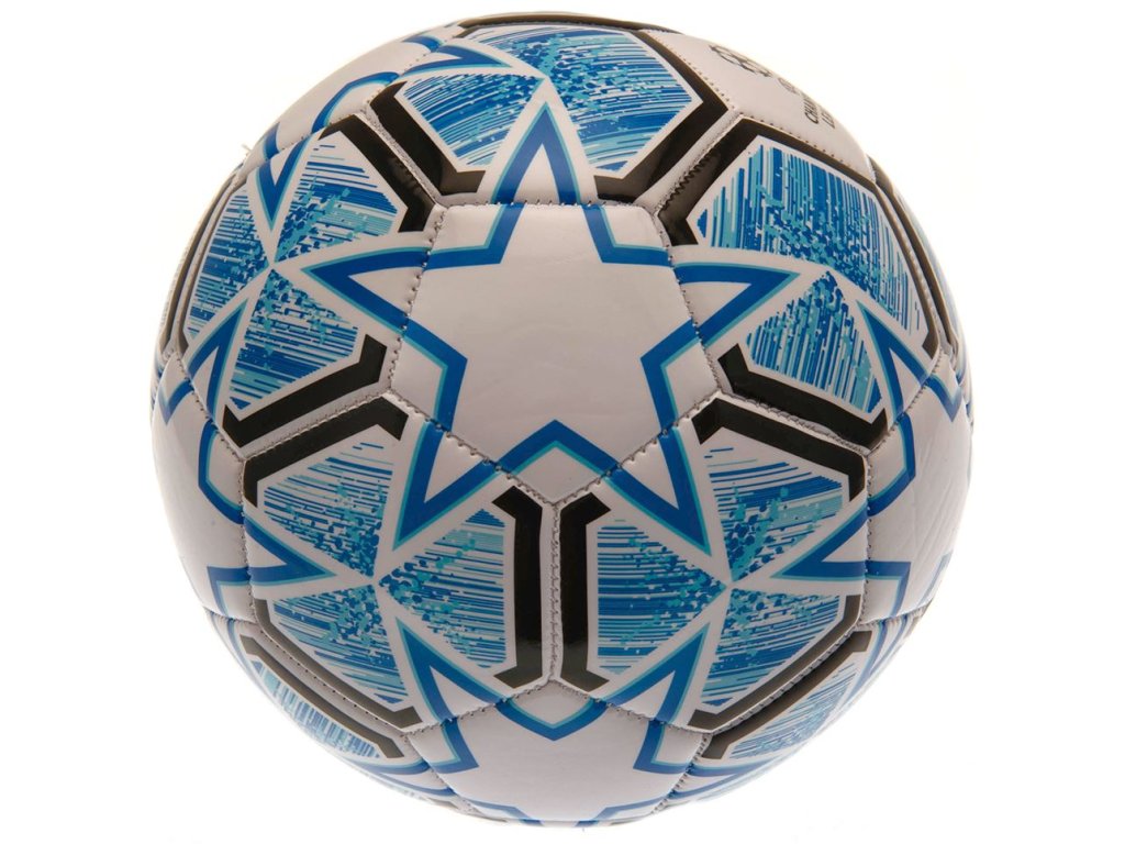 Hrací multicolor fotbalový míč vyvedený ve vzoru Skyfall se znakem prestižní fotbalové soutěže Champions League (Liga mistrů UEFA).