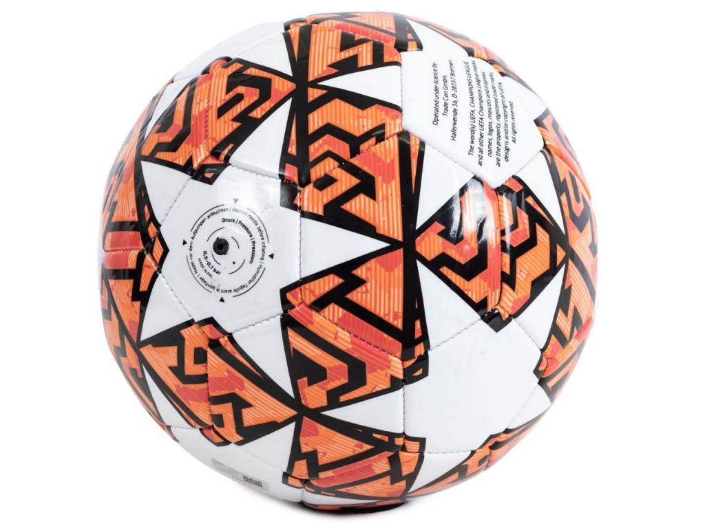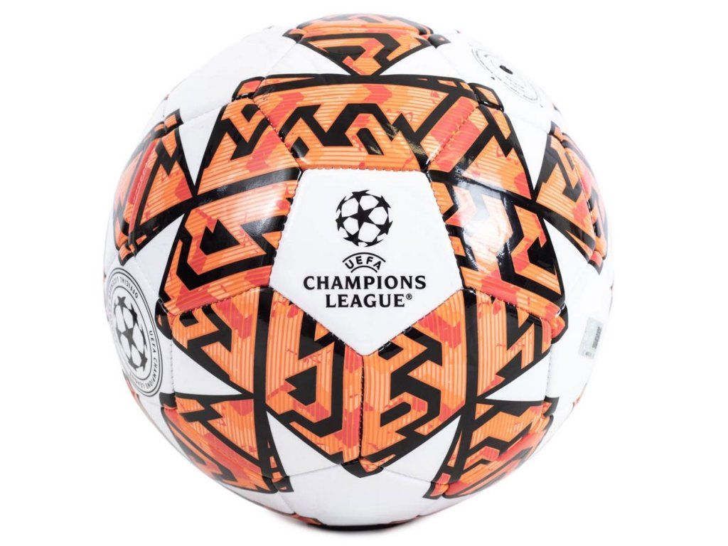 Oranžovo-bílý fotbalový míč vyvedený se vzorem a znakem soutěže UEFA. 26 panelový fotbalový míč pro každodenní použití. Vhodné pro děti ve věku 14 let a starší. Míč je expedován ve vyfouklém stavu.