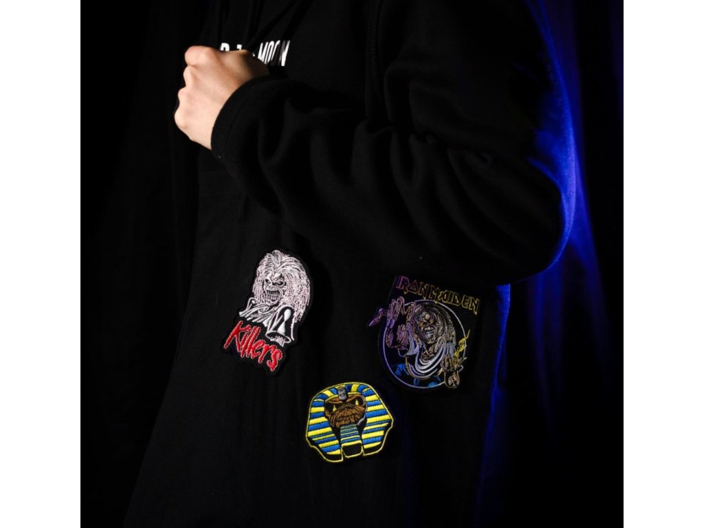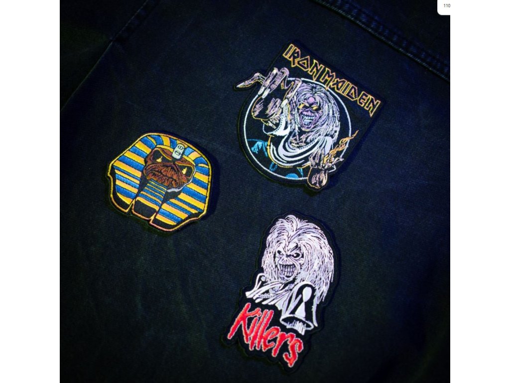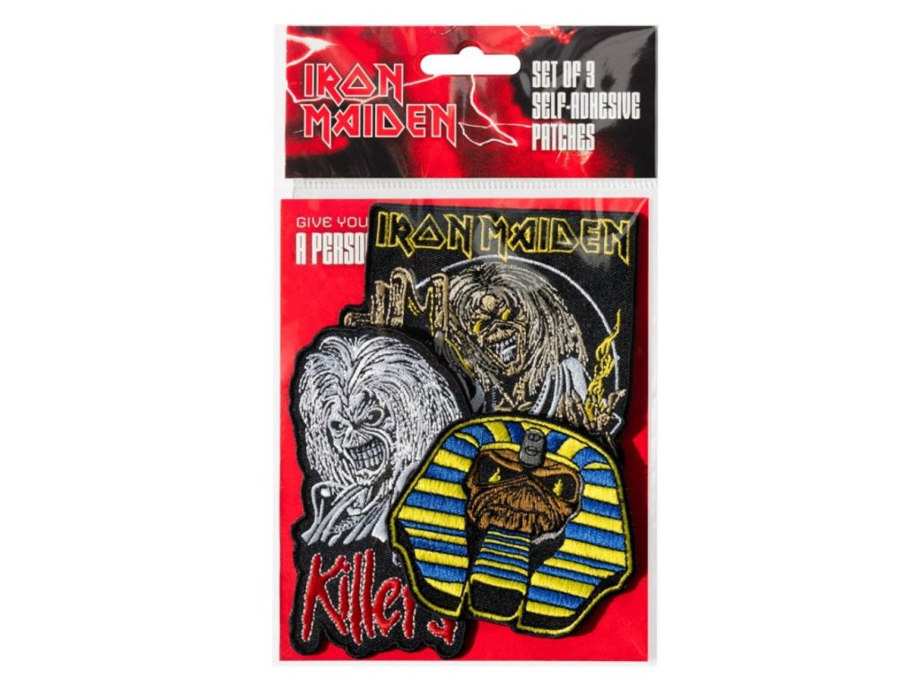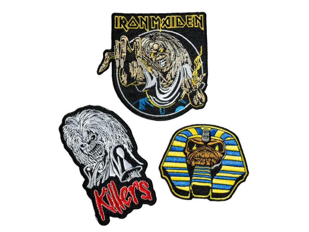 Oficiální produkt - set 3 nášivek z katalogu módních fashion výrobků a merchandise produktů s licencovaným logem, grafikou a fotografiemi hudební skupiny Iron Maiden.