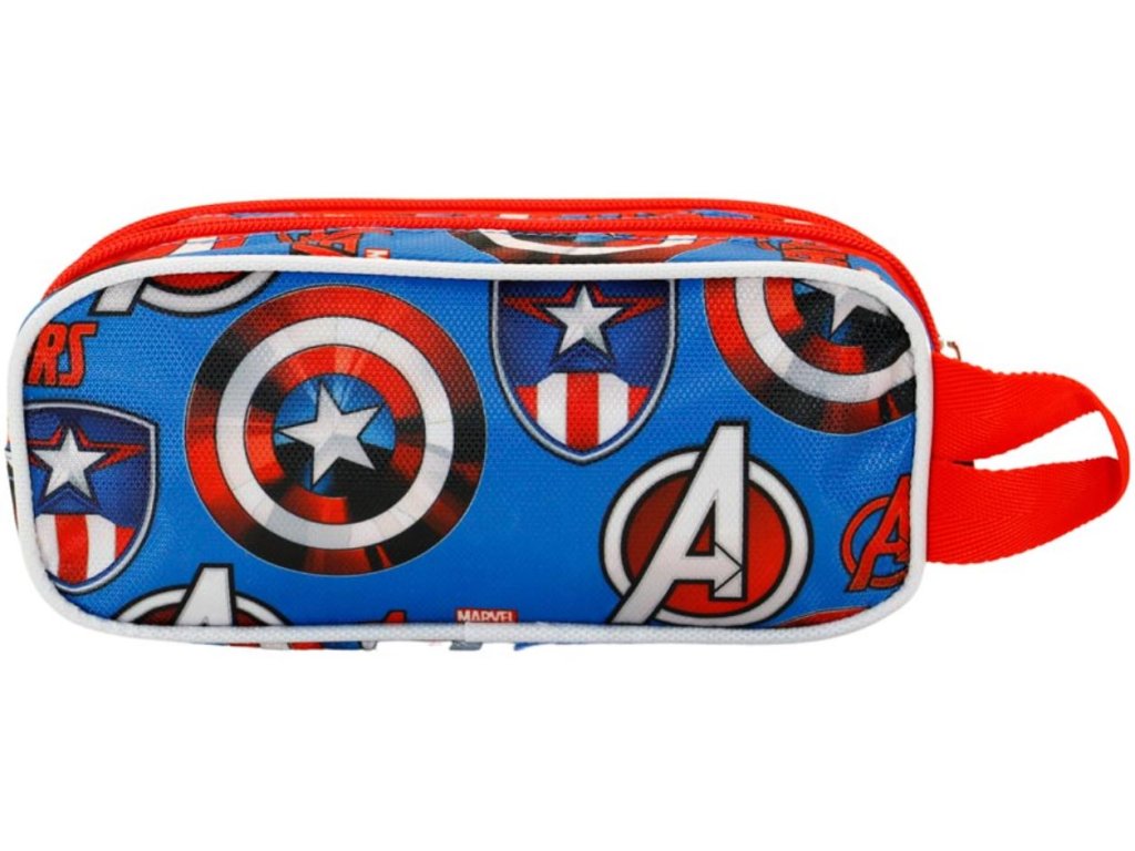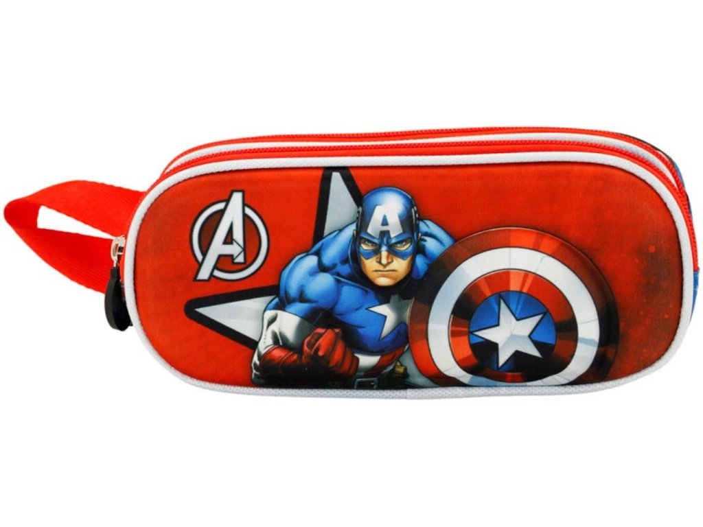 Atraktivní červený penál na tužky s motivem postavy Captain America (Kapitán Amerika) od komiksové společnosti Marvel.