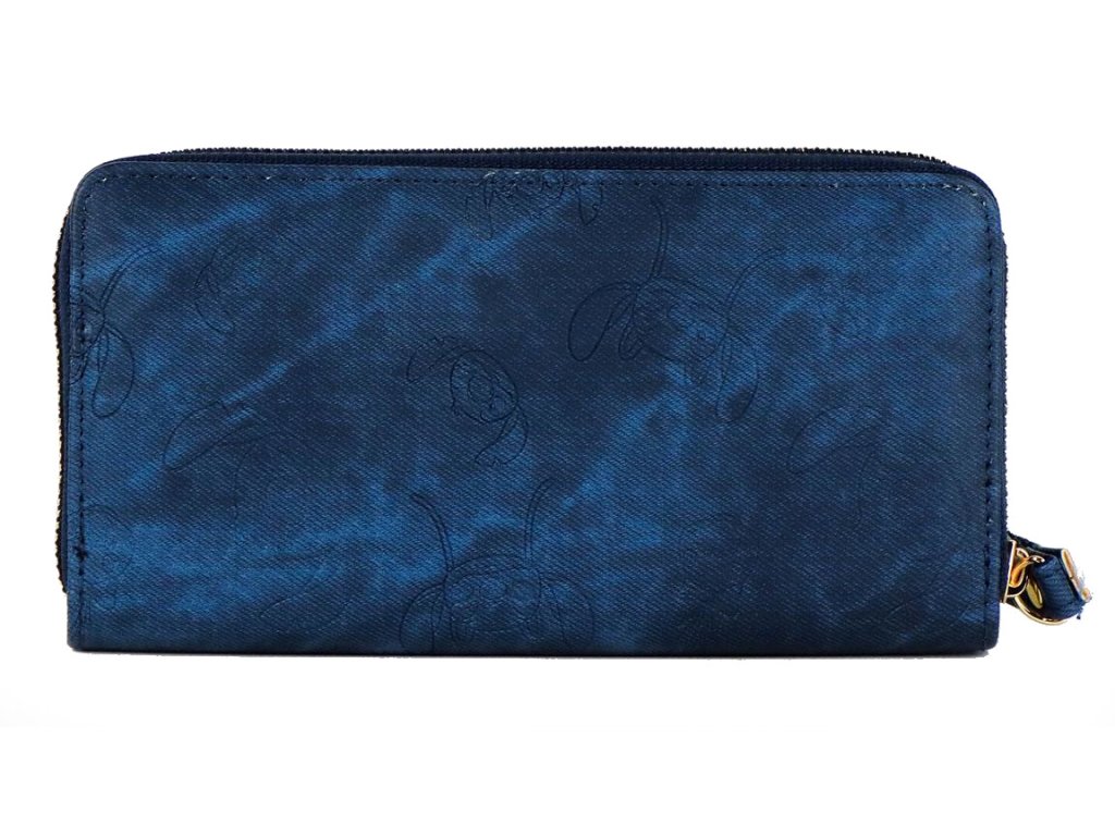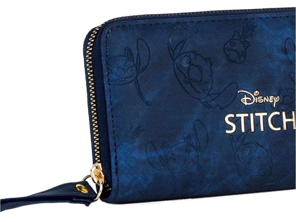 Tmavě modrá peněženka vyvedená s grafickými ikonami Stitche z pohádky Lilo & Stitch od společnosti Disney. Peněženka má spoustu místa na všechny vaše karty, hotovost i drobné a je na zapínání na zip.