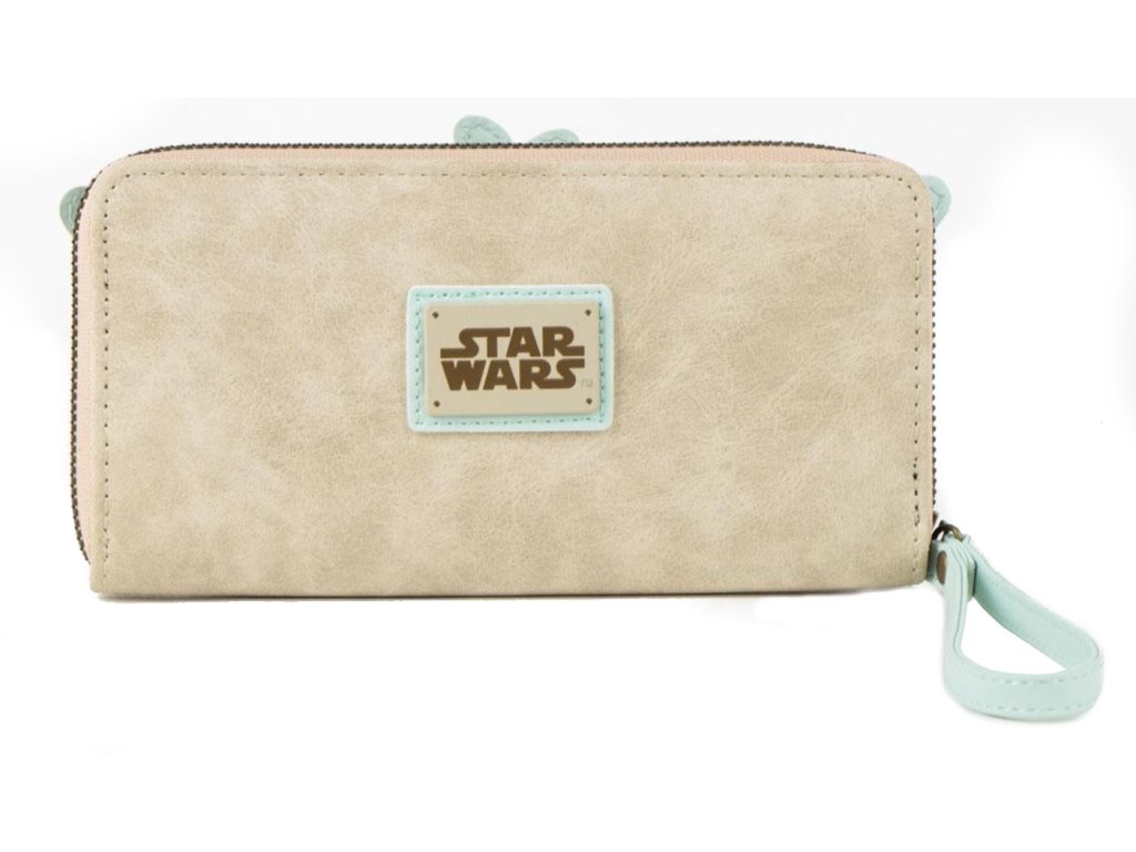 Hnědá peněženka vyvedená s grafikou Baby Yody s vyčuhujícíma ušima. Peněženka má spoustu místa na všechny vaše karty, hotovost i drobné a je na zapínání na zip s poutkem na uchycení na ruku.