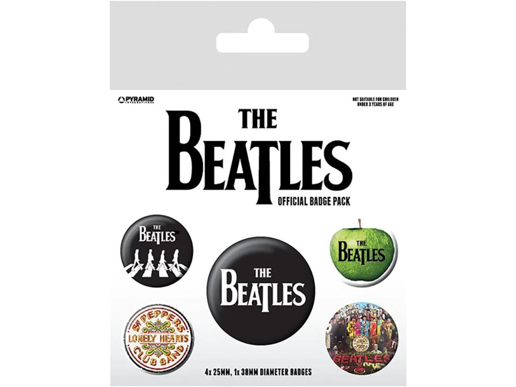 Balení pěti kusů placek s logem a grafikou britské rockové skupiny The Beatles.