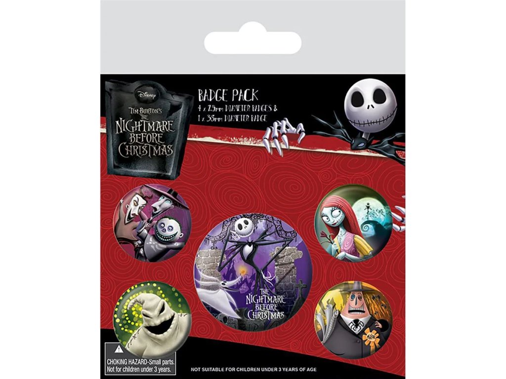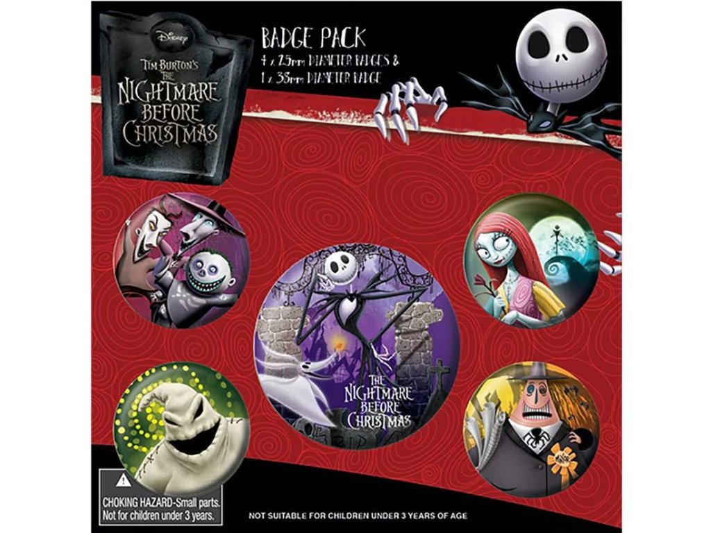 Balení pěti kusů odznaků s grafikou a logem Nightmare Before Christmas.