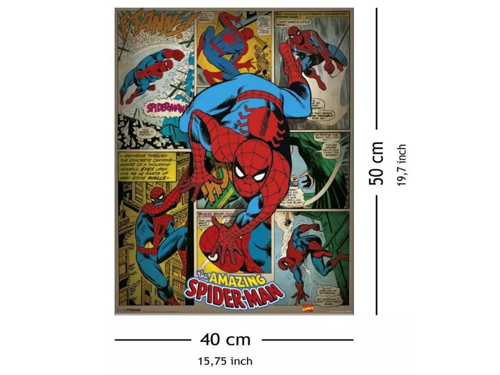 Plakát ve formátu 40 x 50 cm s grafikou retro komiksu pavoučího hrdiny Spidermana od společnosti Marvel. Plakát se hodí jako výzdoba každého pokoje pro všechny menší i větší fanoušky.