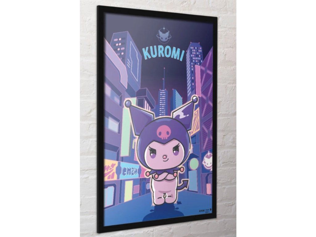 Design plakátu sází na moderní estetiku nočního Tokia a neonových světel. Postavička Kuromi se svým typickým "bad girl" výrazem, zkříženýma rukama a čertovským ocáskem dominuje celému obrazu. Její fialová kapuce s lebkou dokonale kontrastuje s okolím. Pozadí tvoří stylizované mrakodrapy s neonovými nápisy a futuristickou architekturou v odstínech fialové, modré a růžové. Výrazné jméno "KUROMI" v horní části a aura kolem postavy dodávají plakátu hloubku a energii, která rozzáří každou stěnu.