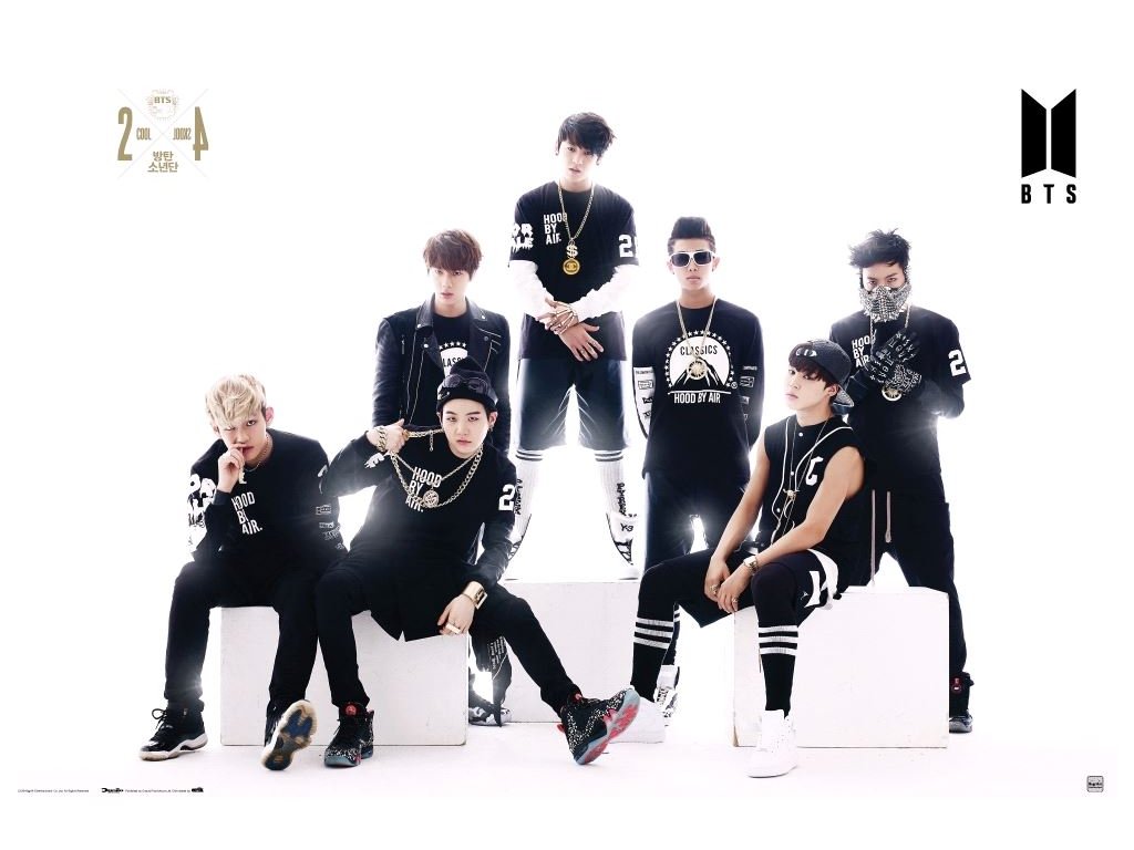 Plakát s fotografií všech sedmi členů skupiny BTS.