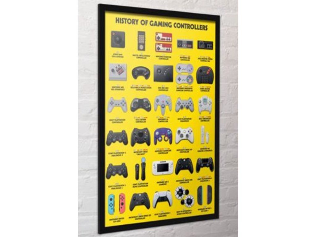 Plakát obsahuje desítky detailně vykreslených ovladačů značek Nintendo, Sega, Sony, Microsoft a dalších, včetně jejich názvů a let uvedení na trh. Sytě žluté pozadí v kombinaci s technickou grafikou dělá z plakátu nepřehlédnutelný doplněk do každého herního doupěte, pracovny nebo obývacího pokoje. Skvělý způsob, jak si připomenout své první herní krůčky a zároveň oslavit technologický pokrok současnosti. Hledáte dárek pro zapáleného gamera? S tímto kouskem historie herního průmyslu nemůžete šlápnout vedle.