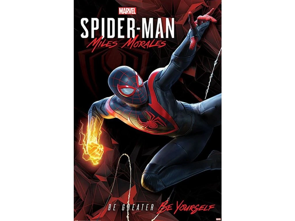 Plakát s vyobrazením superhrdiny Spidermana z videohry Spiderman: Miles Morales. Plakát je vhodným doplňkem pokoje či jiné místnosti každého menšího i většího fanouška.