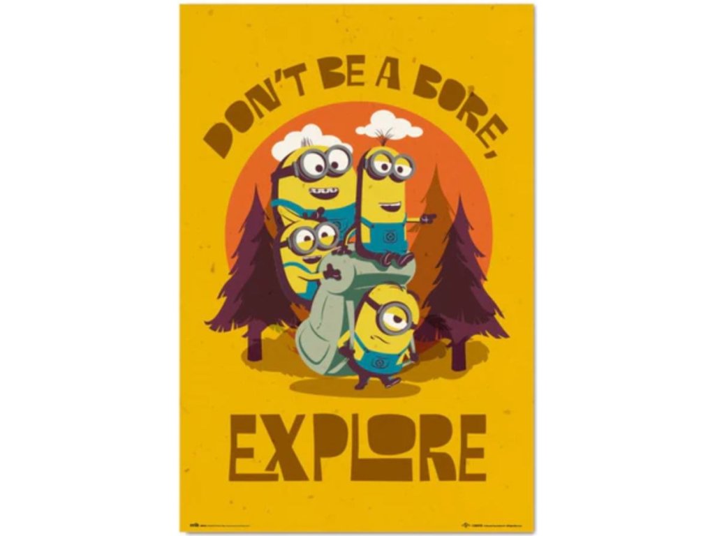 Plakát s grafikou Mimoňů: Nenuďte se a zkoumejte (Don´t be a bore and explore) pro všechhny fanoušky malých žlůtých příšerek, kterým říkáme Mimoni.