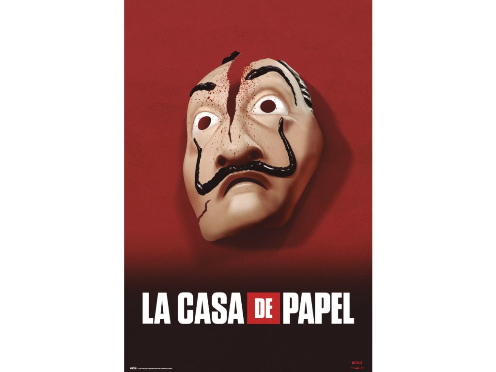 Oficiální plakát z katalogu produktů s licencí španělského krimi seriálu La casa de papel (Papírový dům).
