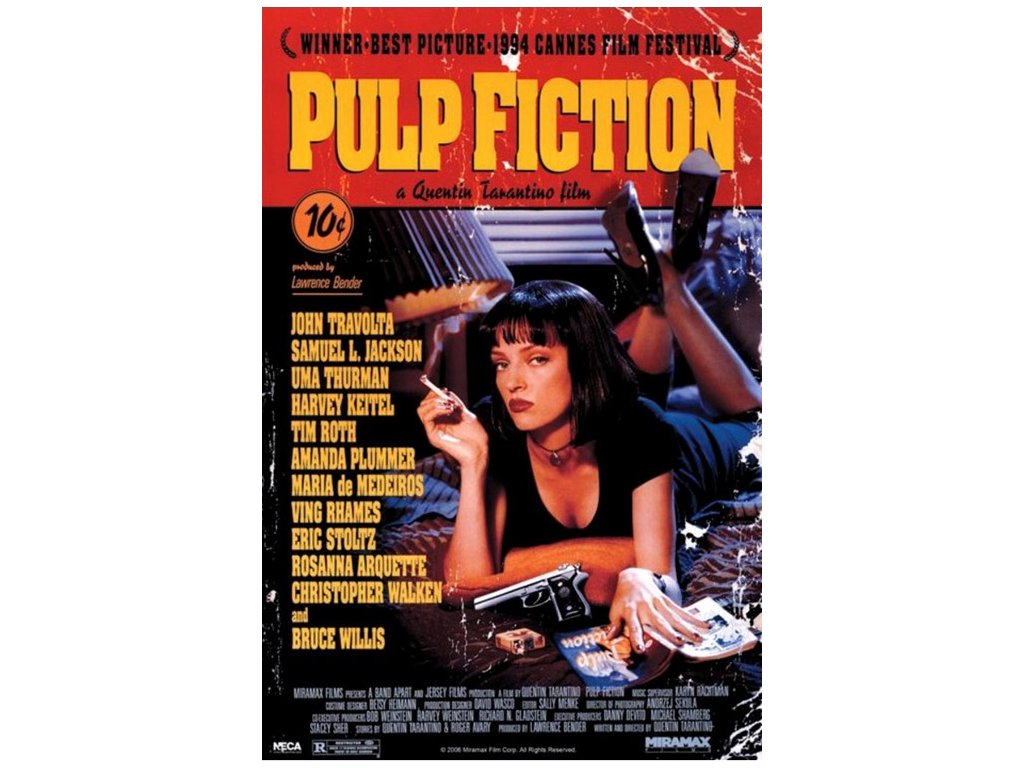 Oficiální plakát z katalogu produktů s logem, fotografiemi a grafikou populárního amerického filmu Pulp Fiction.
