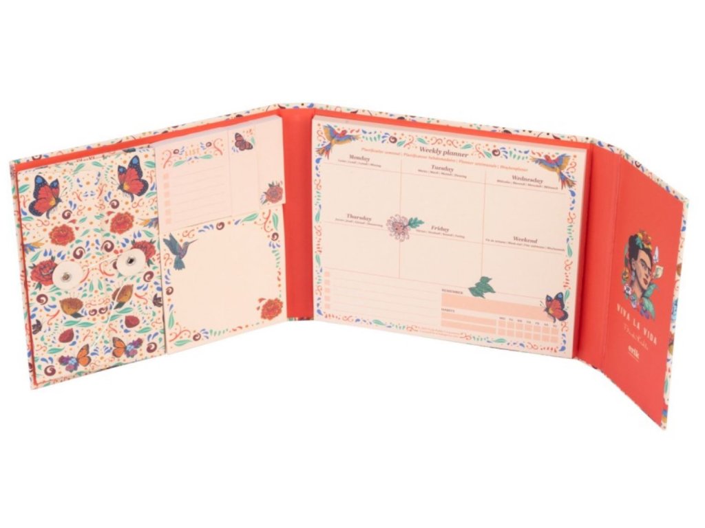 Plánovač stolní inspirovaný malbami umělkyně Fridy Kahlo. Obsahuje týdenní plánovač na vaše osobní i rodinné plánování aktuálního týdne, poznámkový blok pro důležité poznámky či nákupní seznam, blok s lepicími štítky třeba pro rodinné vzkazy, které můžete kdekoliv přilepit a dva bloky s menšími lepicími štítky například pro poznačení důležitých poznámek v bloku. Součástí je i obálka, která je bezpečně uzavřená provázkem. Pro snadné použití knihy je zapínání na magnet.