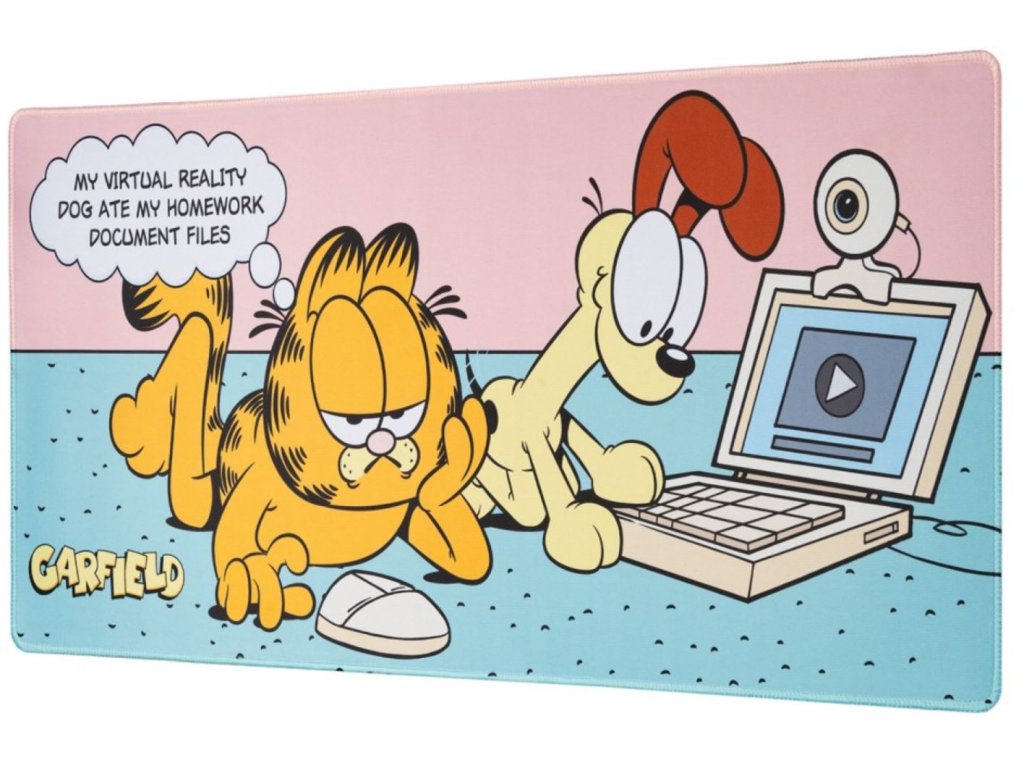 Oficiální produkt - herní podložka na stůl z katalogu kancelářského a počítačového zboží s logem, fotografiemi a grafikou populárního kocoura Garfielda.