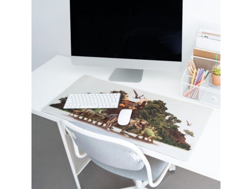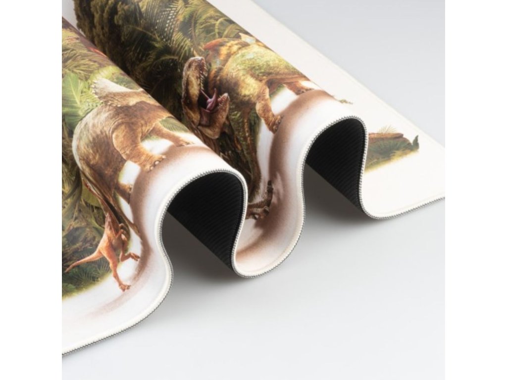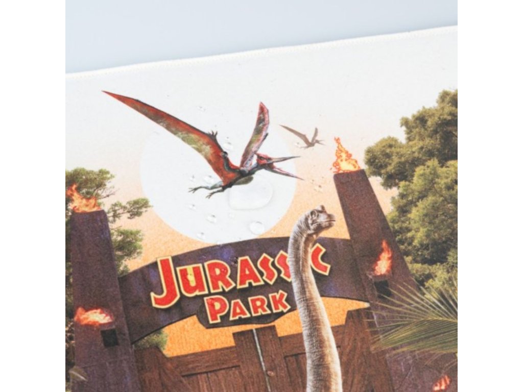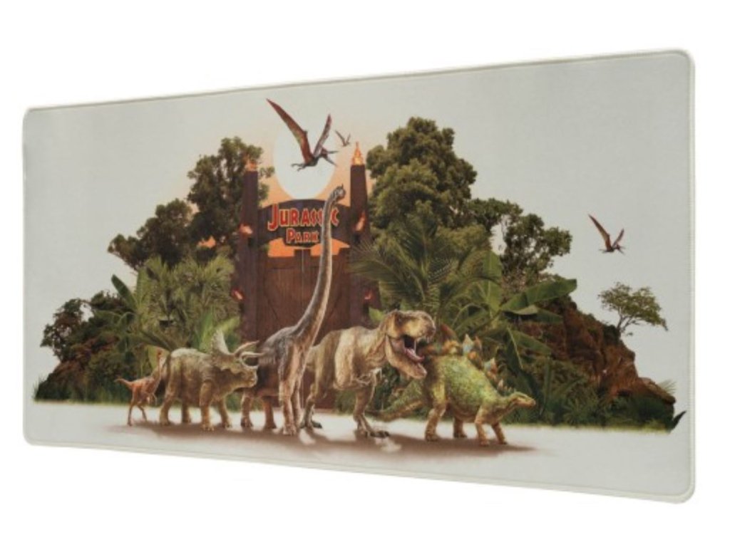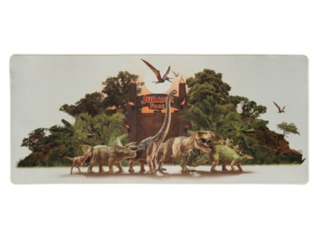 Herní podložka na stůl s grafikou dinosauřího útoku na Jurský park. Textilní povrch s vysokou hustotou, optimální pro intenzivní a přesné používání s jakýmkoli typem myši a voděodolný. Zesílené okraje a protiskluzová gumová základna.