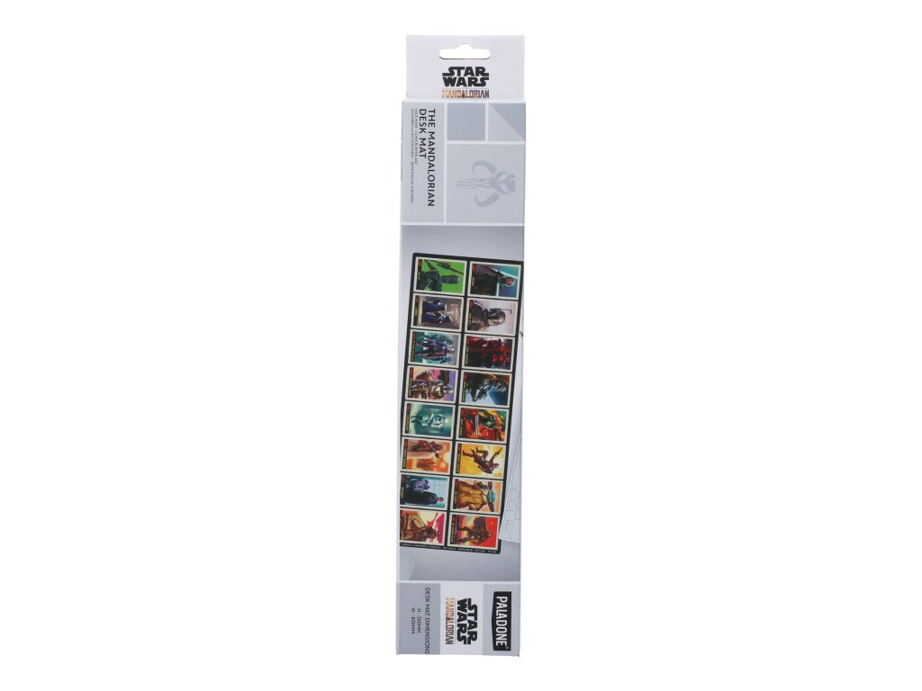 Oficiální produkt - herní podložka na stůl z katalogu kancelářského a počítačového zboží s logem, fotografiemi a grafikou populární sci-fi seriálu Mandalorian.