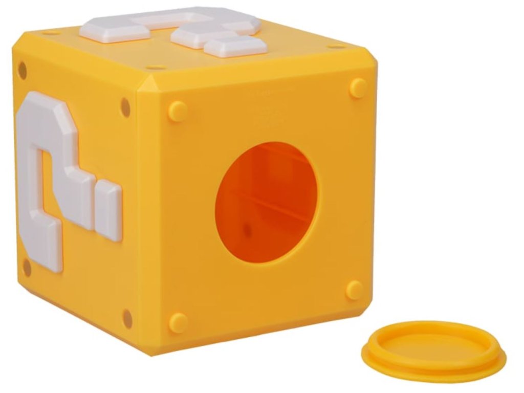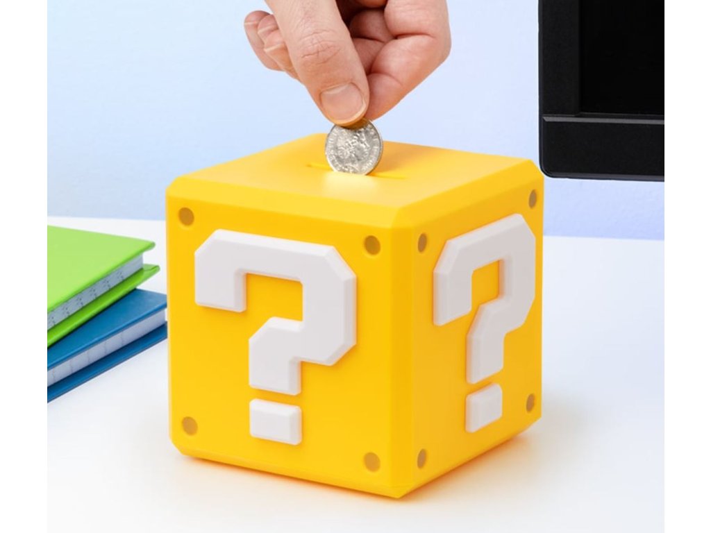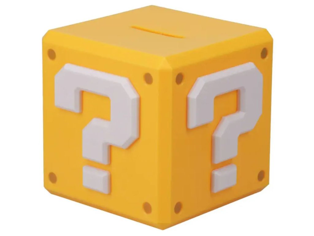 Keramická pokladnička vyvedená ve tvaru a grafice záhadného bloku s otazníkem, který můžete znát z populární fantasy videoherní série Super Mario. Pokladnička je sice vyvedená s otazníkem, ale vy budete přesně vědět, že ukrývá vaše finance.