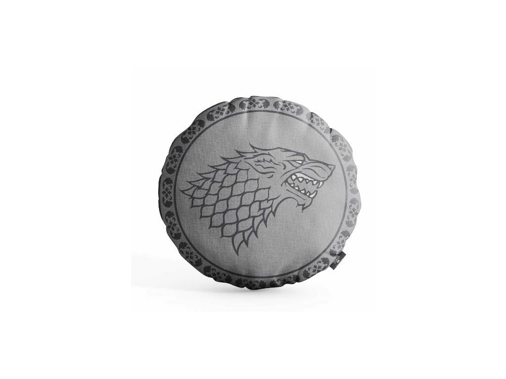Šedý kulatý a oboustranný polštář s motivem hlavy vlka, který znázorňuje rod Starků.