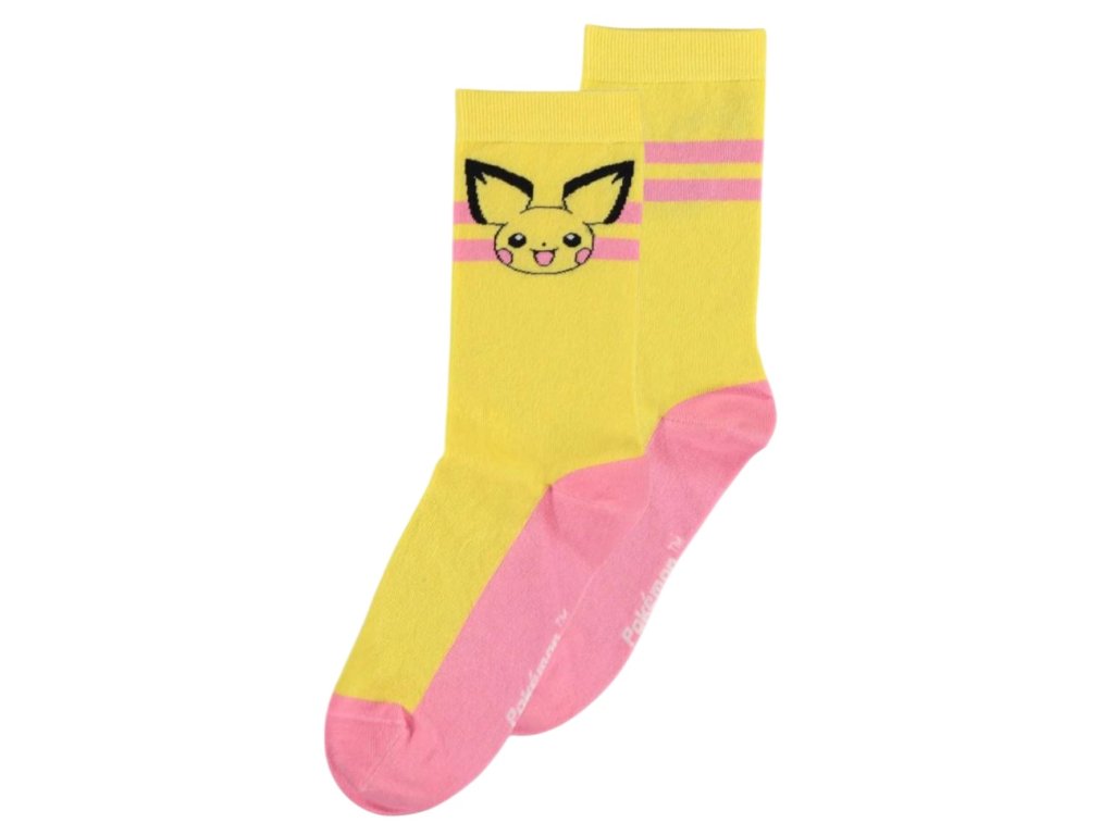 Dámské barevné ponožky s motivem oblíbených Pokémonů rozzáří každý outfit a potěší každou fanynku tohoto legendárního světa. Každý pár zdobí jiný hravý design, díky kterému snadno vyjádříte svůj styl i dobrou náladu. Ponožky jsou vyrobeny z příjemného materiálu, který zajišťuje pohodlí při celodenním nošení. Balení obsahuje 3 páry ponožek, takže svůj look můžete jednoduše obměňovat podle nálady.
